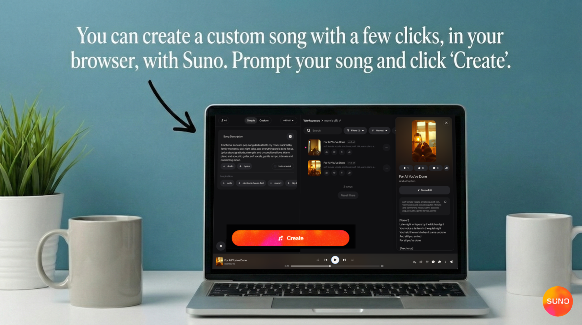 Sign up now and turn your lyrics into real songs with Suno.