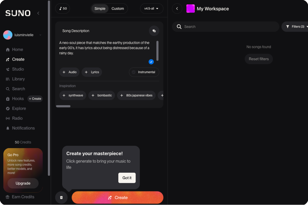 Creating music with Suno AI’s song maker is straightforward. After signing up, click Create on the main menu to open your workspace—this is where you will create your songs. You can create multiple workspaces for different genres, projects, or moods.