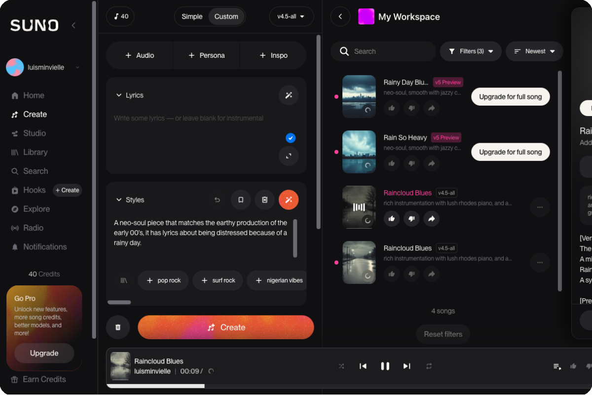 In Custom mode, you get full control over the music creation process. You can upload lyrics you’ve already written, or describe what you want in the “Auto Lyric” section. Suno also lets you upload short audio clips or hum a tune, and the AI can transform it into a song in your chosen musical style. You can even remix existing songs or change their genre.