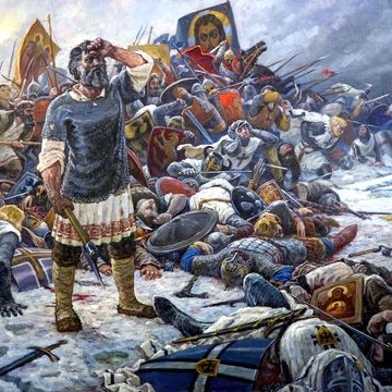 Epic russian medieval ethno-rock, emotional folklore metal ballad, pity, haunting male choir, orchestra, gravelly male, uplifting, slavic-celtic battle saga, heroic, deep flow, bagpipes, pity