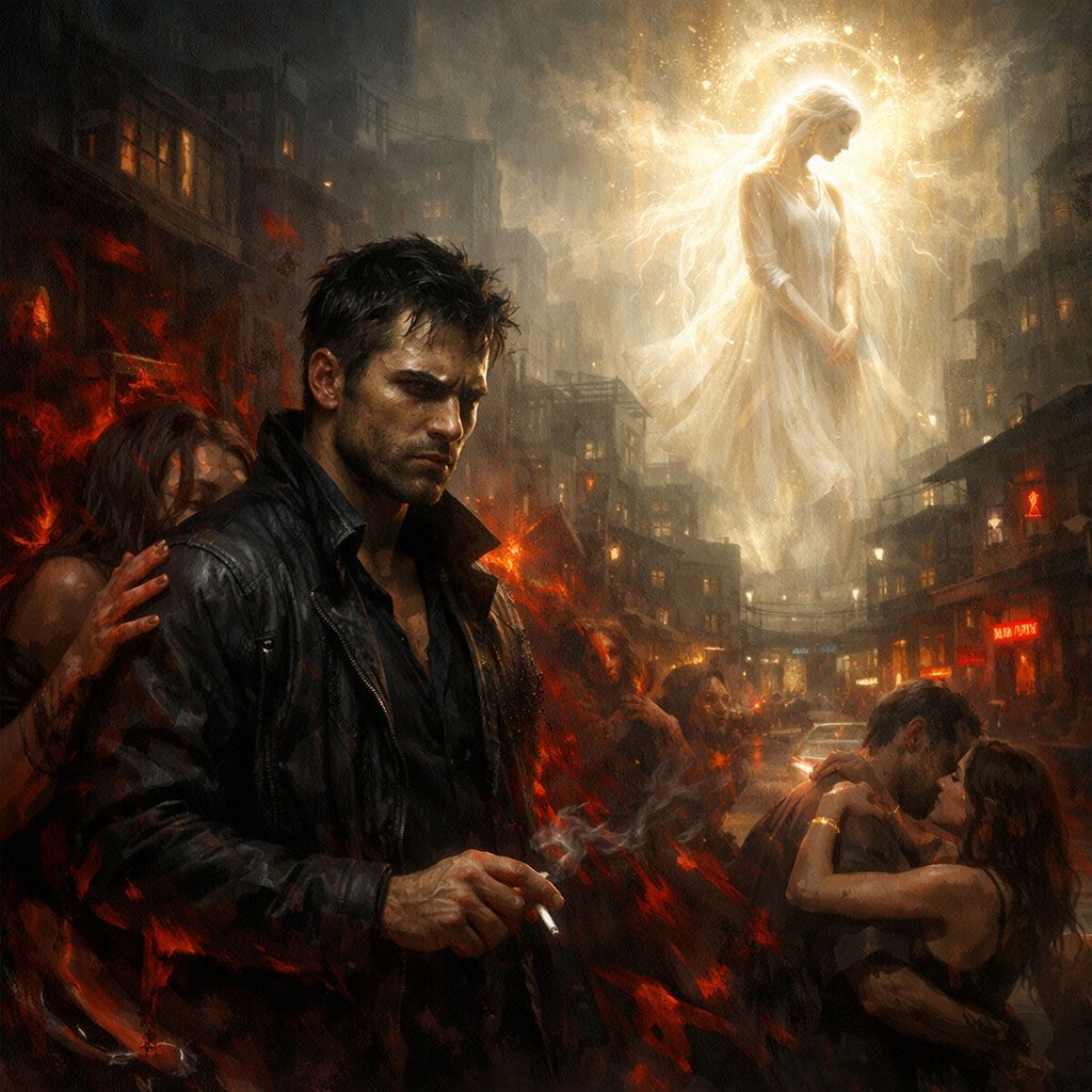A slow, atmospheric 50's track in a minor key features rich male vocals framed by reverb-soaked electric guitar arpeggios and subtle tremolo, Sparse upright bass and brushed snare provide depth, while soft organ swells fill space, creating a moody, enveloping retro texture