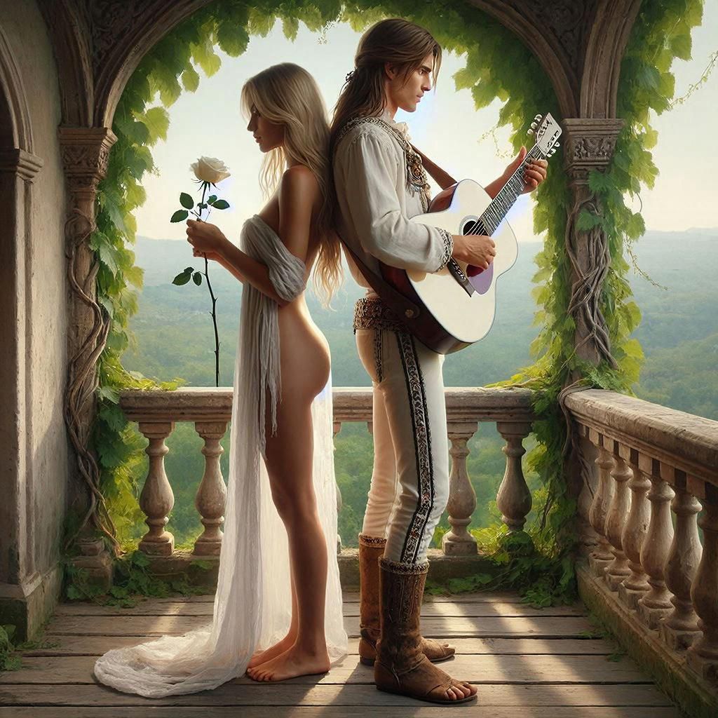 ballad, minor key, slowly, atmosferic, reverberation, duet, chorus, melancholic guitar, minor third guitar, lute, harpsichord, triangle, female voice, female singer, female backing vocals