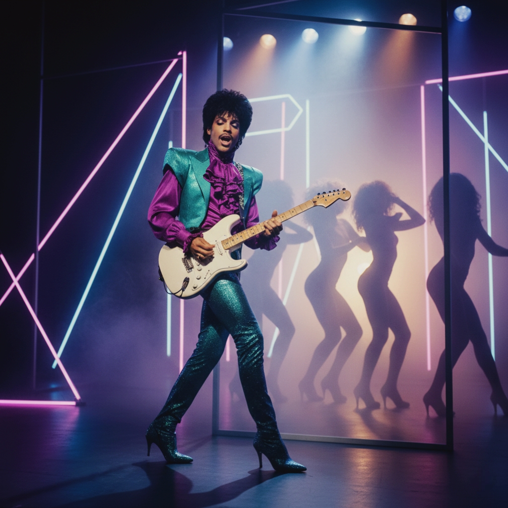 1980s Contemporary R&B, Minneapolis Sound, Synth Funk, 1980s, 1980s R&B, Funk, Minneapolis scene, minimalistic, sexual, playful, sensual, love, rhythmic, black american male high-registered flamboyant raspy vocal, androgynous voice, unique falsetto, soulful, melismatic, smooth glossy R&B production, syncopated electronically programmed rhythms, angularΒ New Wave-inspired rhythms, electric guitar emphasis, heavy layered futuristic sharp synth stabs, jolting jerky rhythms, angular busy guitarwork, minimalistic drum machines, definitive rhythm sections, stripped-down, risque lyricism, naked funk, saxophone bursts, glossy synth lines, synth basslines, jittery analog angular beeping synth, androgynous backing vocal harmonies, urban, uplifting, boastful, romantic, quirky, melodic, passionate, happy, bouncy, punchy, syncopated grooves, jangly funky percussive guitar riffs, keyboards stabs, female backing vocal harmonies, 1980s Funk Rock influences, βModern, βfemale vocal, β4/4 rhythm