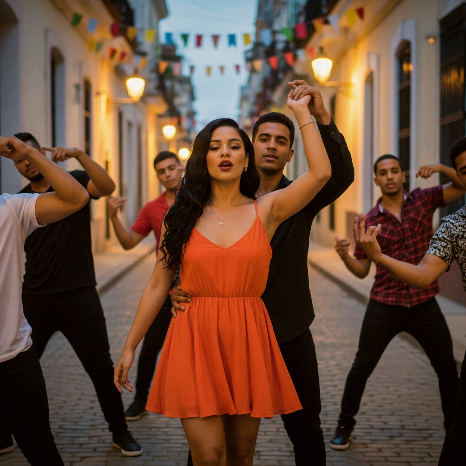 2010s Contemporary R&B, Pop, Electropop, 2010s, tropical, summer, hispanic female nasally girlish vocal, raspy falsetto, passionate, rhythmic, love, sexual, sensual, catchy, MIDI piano keyboard stabs, warm synth stabs, low-frequency synth, heavy bass, trumpet, finger snaps, trombone, melodic, warm, longing, evening, 2010s Latin Pop, Bolero son influences, Hispanic American Music tropes, commercial sound, Son cubano elements, shakers, romantic, mysterious, mellow, playful, boastful, male background ad libs, sparse drum pattern, "hey" chants, fast hi-hats, midtempo, Ratchet influences, βMale vocal