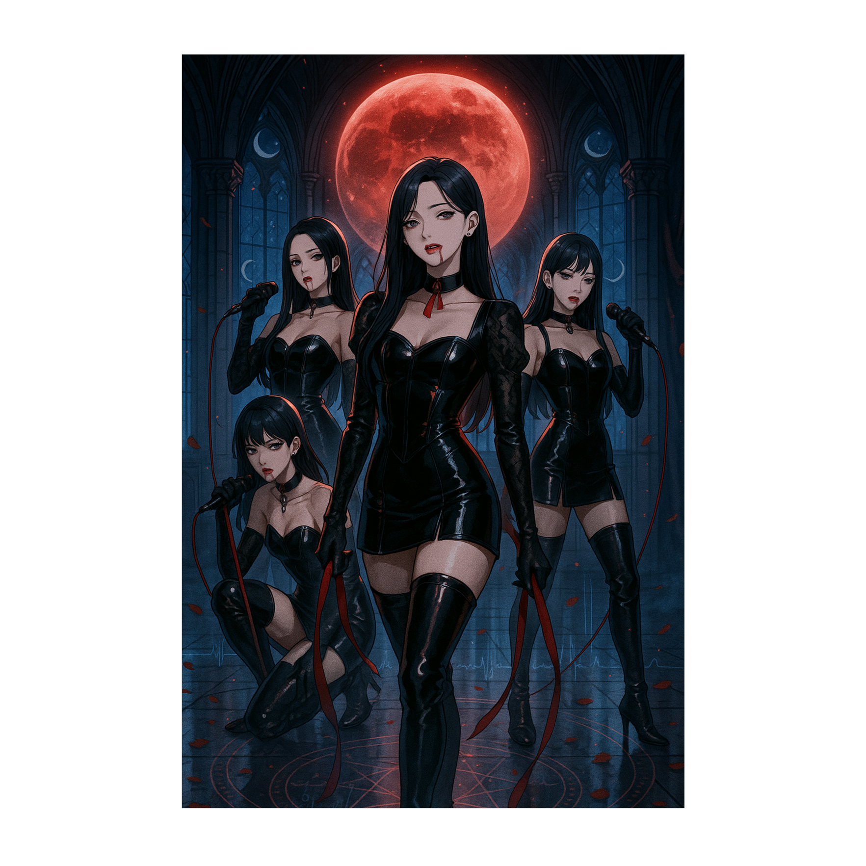 k-pop girl group, dark pop, minimal, bass-heavy, trap beat, crisp claps, 808 sub, staccato synths, whisper vocals, sultry, fierce, chant hook, tight harmonies, clean mix, modern kpop