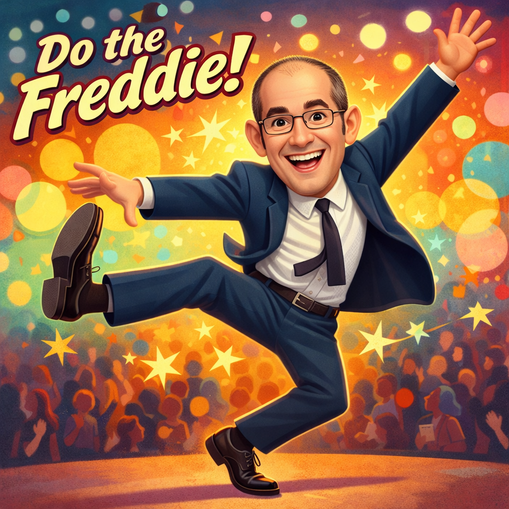 Explosive 1965 British Invasion dance rock, BPM 162, Key: A Major, 4/4 time, Fast, punchy backbeat with driving kick, snappy rimshot snare, heavy tambourine throughout, handclaps layered on choruses, walking melodic bass line, bright jangly electric guitars with light grit, short twangy lead fills between vocal lines, Energetic, cheeky, animated male lead vocal with playful Liverpool-style inflection, Big call-and-response chorus with gang shouts (“Do the Freddie! Hey!”), Bouncy I–IV–V progression, Brief instrumental dance break with stomps and claps to encourage movement, Retro mono mix feel with tape warmth and slight saturation, Lyrical theme: a wild 1965 TV dance craze — kick legs out, swing arms opposite, goofy organized chaos, Hullabaloo and Shindig references, celebrating awkward, unstoppable joy on the dance floor