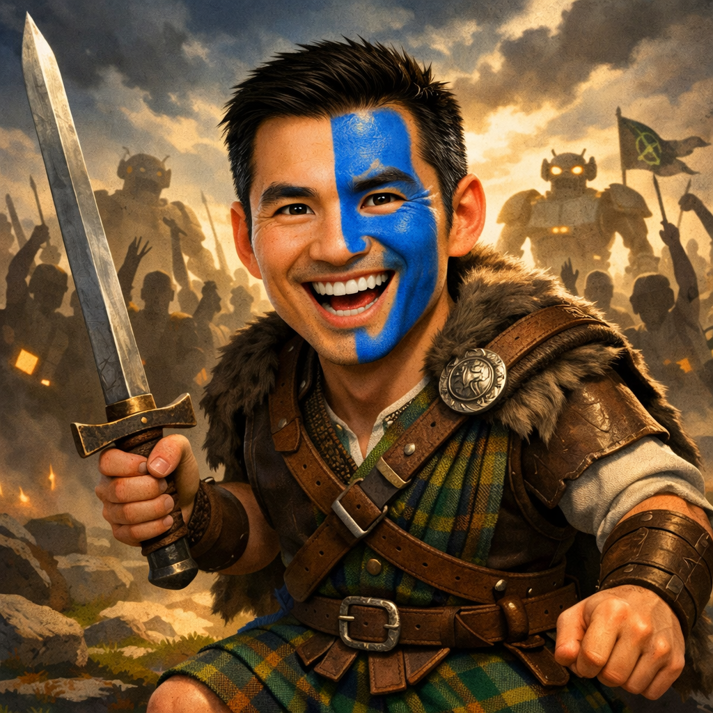 Epic Celtic battle cry anthem at 148 BPM, driven by bodhrán war drums, stomping claps, bagpipes, soaring fiddles, and cinematic choir, Male lead vocal with commanding heroic tone, supported by group chants in the chorus, Theme: A mentor and warrior named France — misdirection between France the man vs France the country, Big hook must repeat: “Conquering France — the man, not the country!”