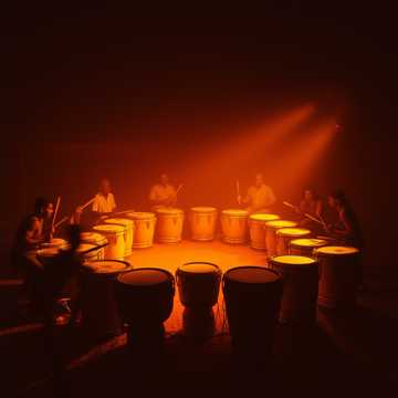 A deep Afro-Tech House track driven by syncopated tribal percussion and heavy sub-bass, Complex polyrhythms of congas, batucada toms, and off-beat shakers create a rolling, earthy pulse under layered analog synth drones and filtered atmospherics, Fragmented vocal chants in an unknown tongue echo through long reverb tails, chopped and looped in rhythmic patterns, The groove evolves through tension-and-release builds, maintaining hypnotic movement ideal for a late-night dance floor ritual, Warm yet primal, deep yet kinetic