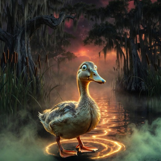 [Aesthetic: Sinister cosmic bayou fable where a quirky duck’s mocked quack becomes echoing legend blending whimsical story with haunting doom grandeur and massive reverb]