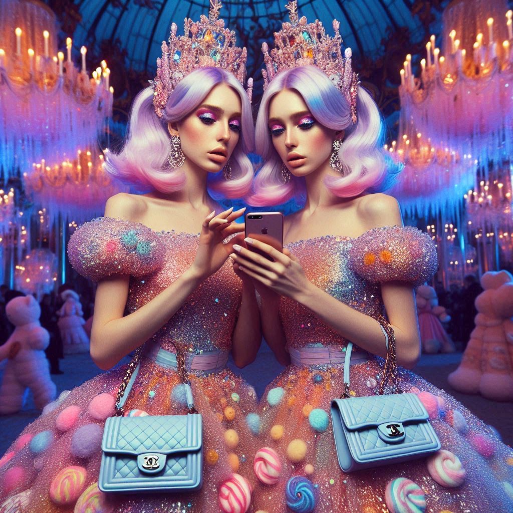 [Vocals: Twin female voices—one breathy, intimate; one sharp, glossy, playful; layered giggles, whispered gasps, and melodic “ooohs” add sparkle, ]
