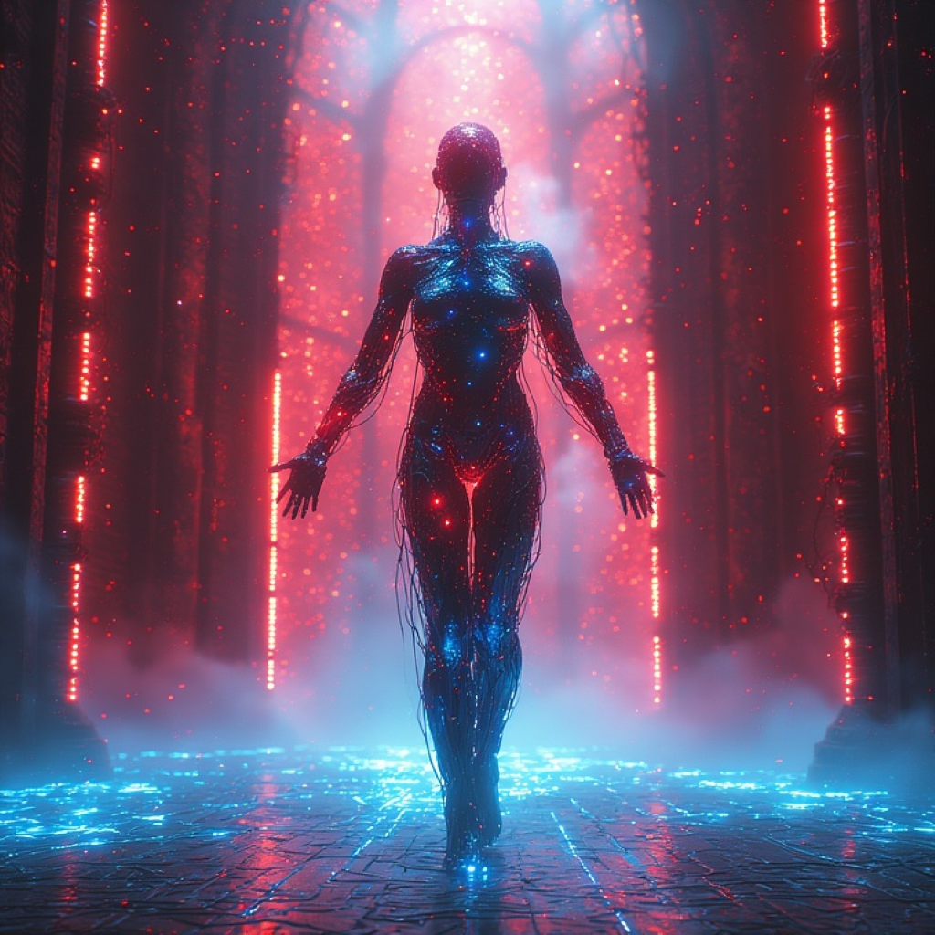 Thunderous dark metal riffs lock in with pounding electro house drums and a driving synth bassline, Processed, heavily effected vocals alternate between distorted growls and ethereal, robotic runs, Intense breakdowns pulse with glitchy synth stabs; drops fuse metal aggression with club energy