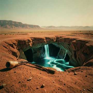 Pure didgeridoo ceremonial underworld drone, extremely deep and raw, subterranean Australian earth resonance, slow breath-driven pulse, volcanic belly-tone, ancient cavern vibration, minimal and unbroken, no vocals, no lyrics, no drums, no melody instruments, no synths, The sound moves across red soil and stone, then drops beneath the land into the black, molten core of Mother Earth, There it meets hidden inner waters, heavy and pressurized, which begin to pulse and travel through ancient ley lines beneath mountains, deserts, and oceans toward Lake Titicaca, Dark, sacred, primordial, tectonic, hypnotic, elemental, reverent, immersive, 432 Hz feel, organic breath texture, deep earth intelligence, Negative prompt