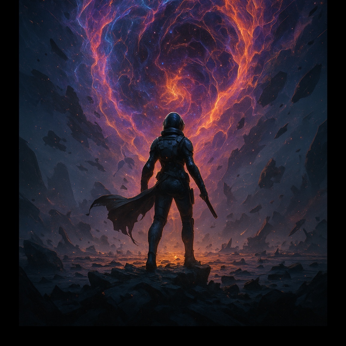 Setting: Dogfight above a shattered planet or asteroid belt; survival depends on sheer willpower and instinct