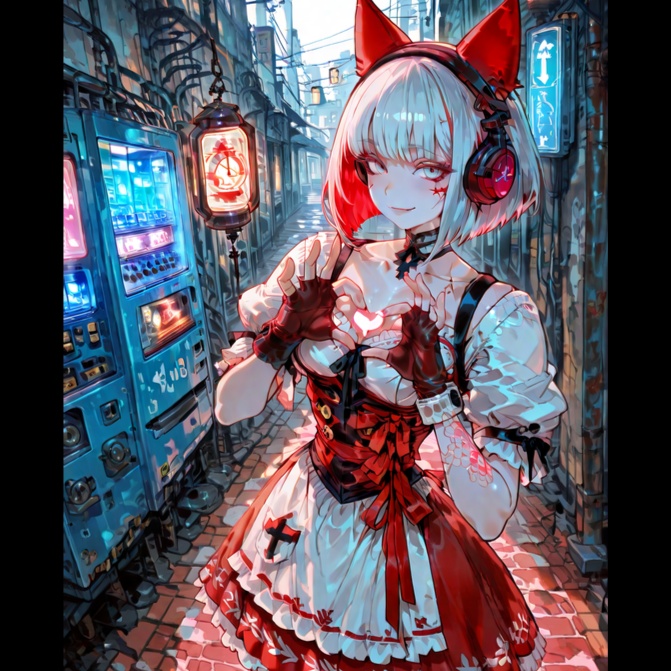Yandere decadent, witch house-y. She is a red DJ Girl.