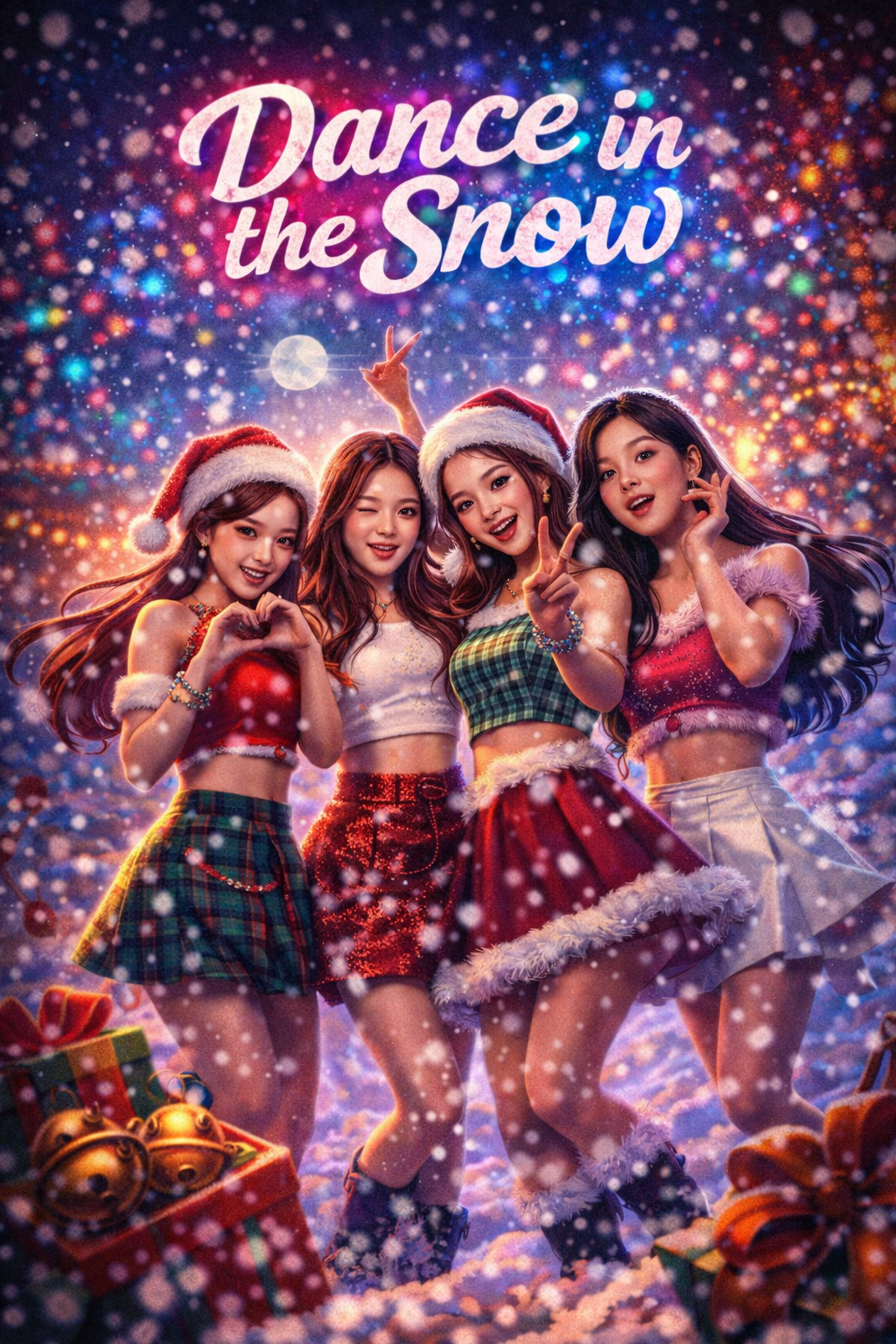 Festive Christmas EDM K-pop trap โ sparkling supersaws, heavy 808s, trap hats, cute K-pop group harmonies, sleigh-bell percussion, massive drops, Korean-English switch