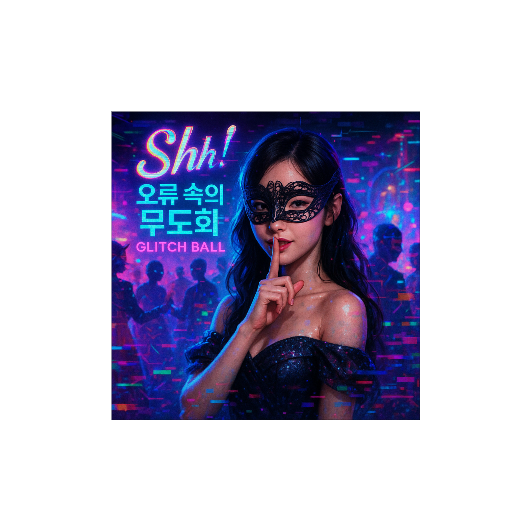 Begins with smooth jazz piano chords and brushed drums under dreamy female harmonies, As it builds, trap hats and glitchy vocal chops slip into the mix, triggering a shift into an unpredictable glitch-hop drop layered with distorted brass stabs and elastic bass, Mid-track, an EDM build explodes with vocodered shouts and hyperpop textures, K-pop-style vocals oscillate between airy falsetto, fierce rap, and whispered spoken lines, Thematically, the lyrics describe a surreal masquerade ball happening inside a digital system failure โ where emotion, memory, and reality blur, A celebration of collapse with rhythm and sparkle
