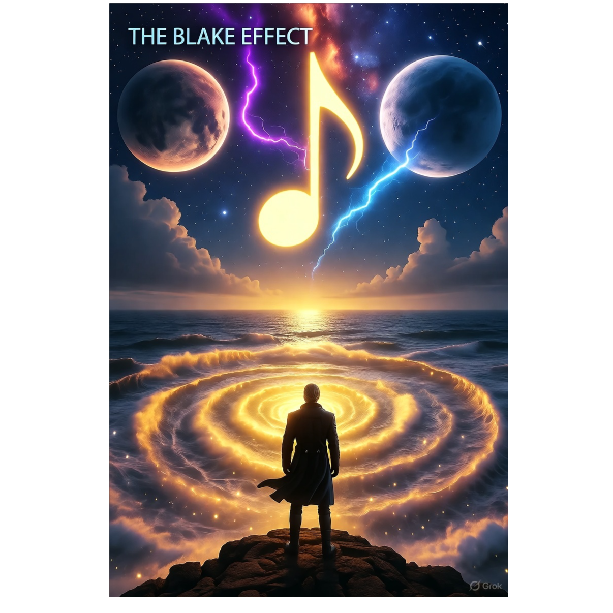 Deep roots-reggae groove fused with cosmic ambient pads, Gentle percussion, rim-snare guitar, lush analog bass, soft echo vocals male lead with female harmonies, Slow 74 BPM in C major, Mystical, emotional, cinematic, Add ocean-wave SFX and soft reverb tail to mimic island breeze, Ethereal synths swell during bridge to create “Blake Effect” moment of transcendence