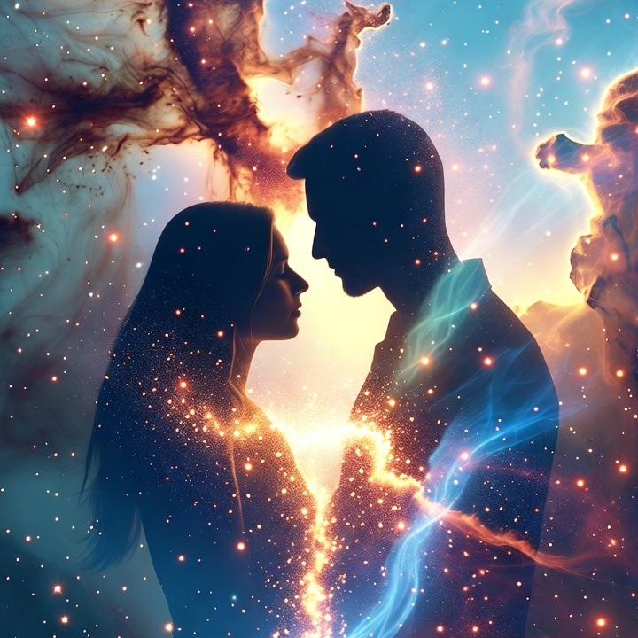 Futuristic electro-pop duet with a dreamy cosmic atmosphere; male and female vocals in call-and-response and harmonies; breathy sensual tone, warm synths, shimmering pads, stardust chimes, and a euphoric, uplifting chorus; celestial sound design, reverb, and emotional build; cosmic, romantic, and transcendent