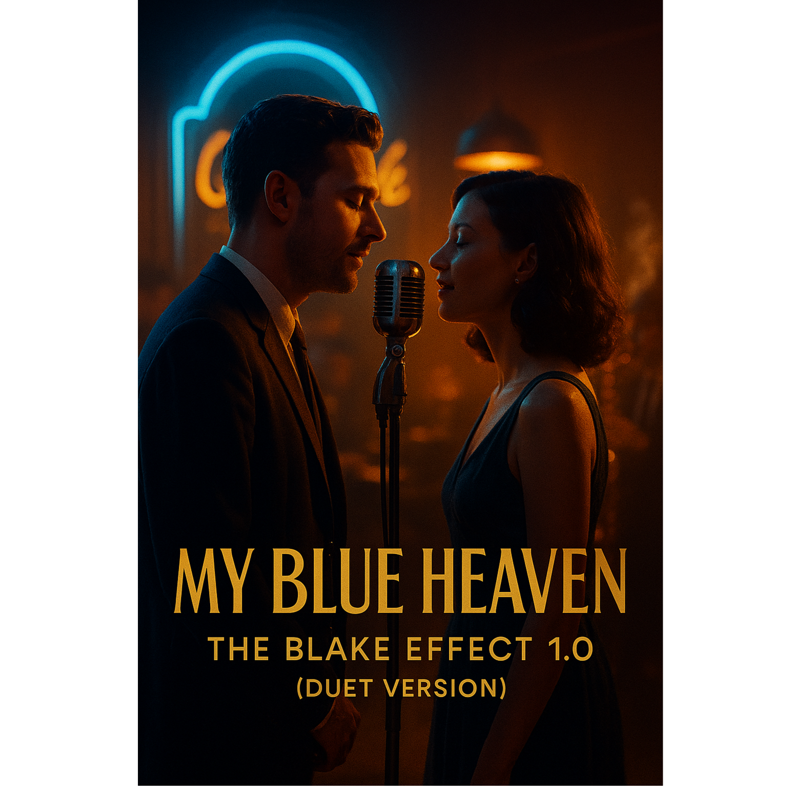Romantic cinematic jazz duet with male and female vocals, Soft swing tempo with upright bass, brushed drums, smooth electric piano, and subtle saxophone, Retro microphone reverb on both voices for vintage warmth, Harmonic call-and-response verses leading to lush harmonized choruses, Evoke 1920s elegance blended with modern cinematic production — cozy, dreamy, timeless, The Blake Effect 1, 0 atmosphere: warm, emotional, classic meets now