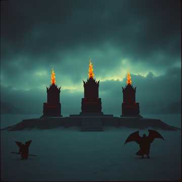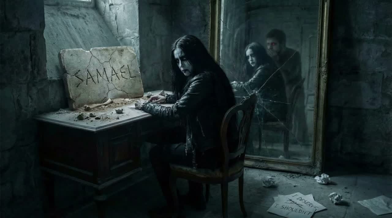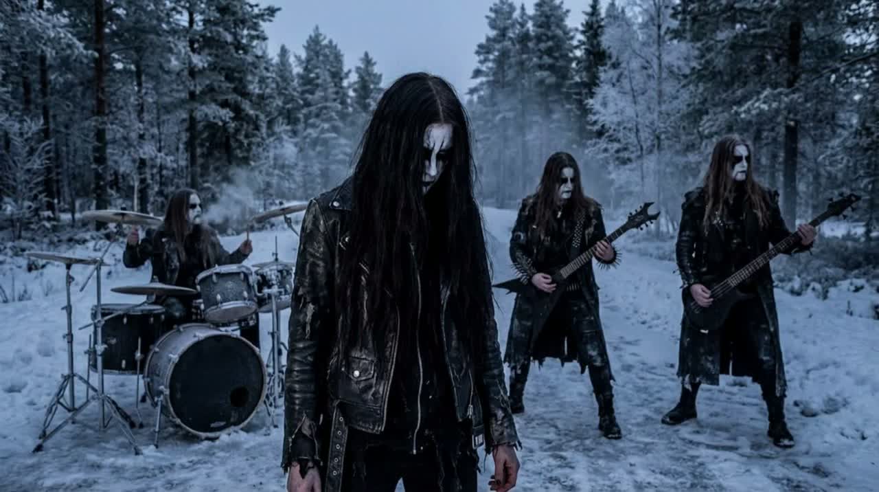 The black metal track begins with haunting clean guitars and icy ambient synths, then erupts into downtuned, tremolo-picked riffs, blast beats, and booming bass, Verses feature layered, reverbed shrieks, gutturals, whispers, Choruses unleash harmonized growls, melodic guitar leads, dense layered riffs, sweeping orchestra swells, and vast reverb, Opera-style choral passages interlace with frenetic tremolo solos and demonic vocals, merging into a powerful, immersive wall of sound, ‑lo-fi, ‑low quality, ‑emo, ‑emocore, ‑emotional, ‑core, ‑metalcore, ‑deathcore, ‑whiny vocals, ‑whine, ‑post-hardcore influence, ‑death metal, ‑power metal, ‑orchestral, ‑symphonic, ‑clean vocals, ‑clear vocals, ‑polished, ‑melody, ‑soft, ‑amateurish, ‑unskilled artist, ‑trap beats
