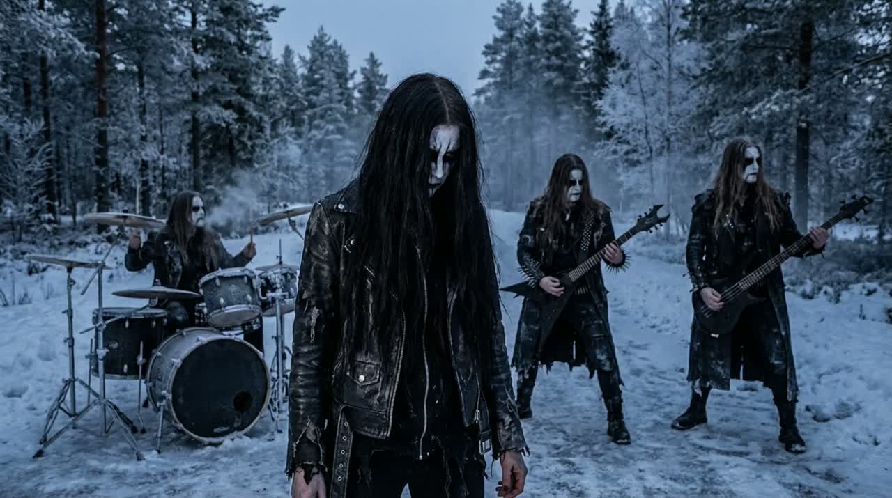 black Metal, raw black metal, aggressive blast beat drumming, heavy distorted rapid tremolo guitars, heavy distorted guitars, piercing shrieks, distorted tremolo-picked guitars, piercing screams, aggressive dark lyrics, melancholic instrumental intro, dark chords, dark ambient, dark, bleak, cold, despairing, aggressive, nihilistic, grim, solitude, dark atmospheric synths, harsh Vocals, harsh black Metal Shrieks, harsh whispered Vocals, harsh guttural Vocals, distorted basslines, ‑lo-fi, ‑low quality, ‑emo, ‑emocore, ‑emotional, ‑core, ‑metalcore, ‑deathcore, ‑whiny vocals, ‑whine, ‑post-hardcore influence, ‑death metal, ‑power metal, ‑orchestral, ‑symphonic, ‑clean vocals, ‑clear vocals, ‑polished, ‑melody, ‑soft, ‑amateurish, ‑unskilled artist, ‑trap beats