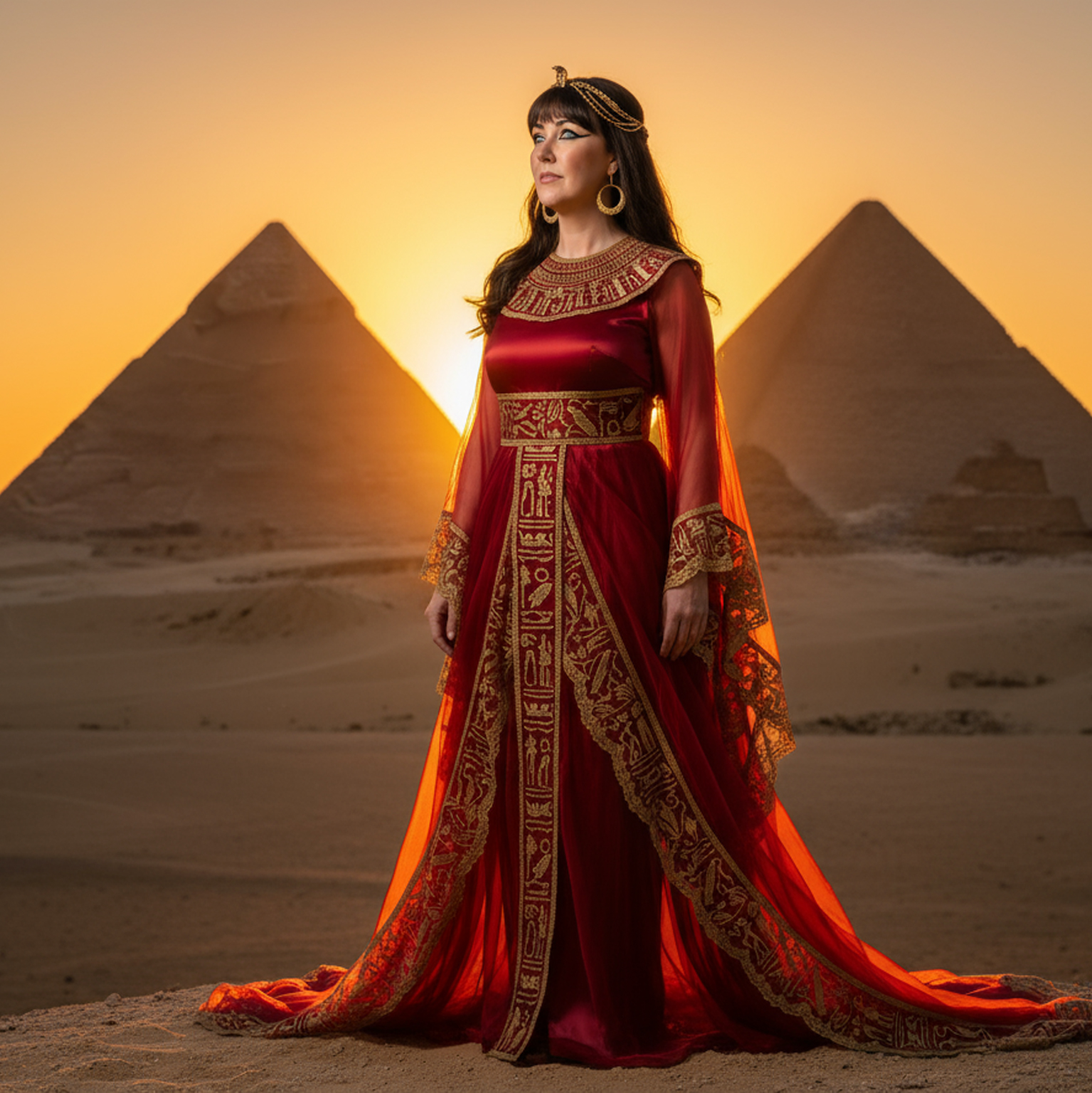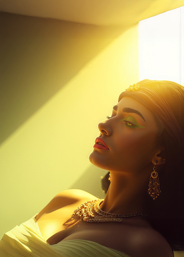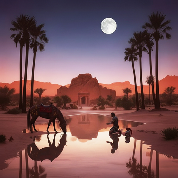 Male and Female vocalists, Verses 1, Chorus 1 and Verse 2: Slow but rising ambient orchestral and Indie-classical soundscapes using ancient Egyptian Harp and Persian pan flutes, hammered Santur strings, plucked Qanun and lute strings, and woodwind oboes to evoke the sound of wind whistling through rock caves, drifting sands drifting across desert dunes, the eternal rising and setting sun, Ancient Egyptian atmospheric desert ambience, featuring ethereal female vocals and chanting, Extended “ah” “um” and “oh” meditative soundscapes, woven into and between the intro, verses, and outro, Verses 3 and 4, slow tempo: The ebb and flow of the Nile River is accompanied by hand-beat rhythms that are slow and hypnotic on stretched-skin drums, Chorus 2 and Bridge: The tempo increases, leading into progressive rock opera and reverb-laden electric rock guitar solos, Female chants transition to modern background vocals as the music progresses from ancient strings to progressive rock, ‑Rap, ‑Power Metal, ‑Power Drumming, ‑Fast Drumming
