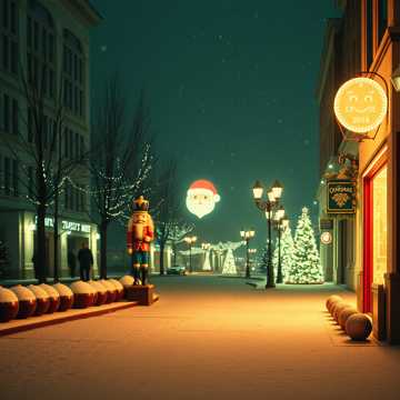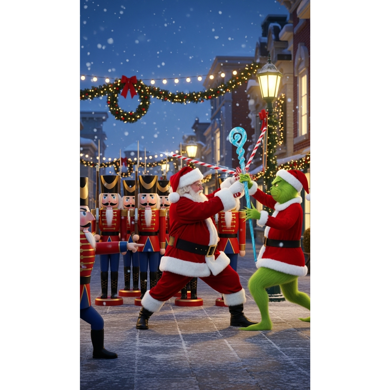 Bright, epic Christmas pop with LOTS of festive sleigh bells and shimmering Christmas bells, Upbeat tempo (118–126 BPM), Add powerful orchestral drums, cute sparkly synths, warm bass, and cinematic strings, Include small toy-march percussion to evoke nutcracker soldiers, Magical, adventurous atmosphere like a Christmas movie battle turning into friendship, No harsh vocals; use sweet, energetic pop vocals (male or female), joyful tone, Big holiday climax, heroic and heartwarming