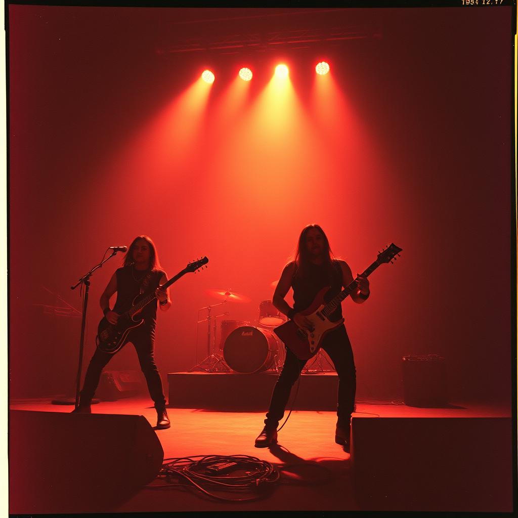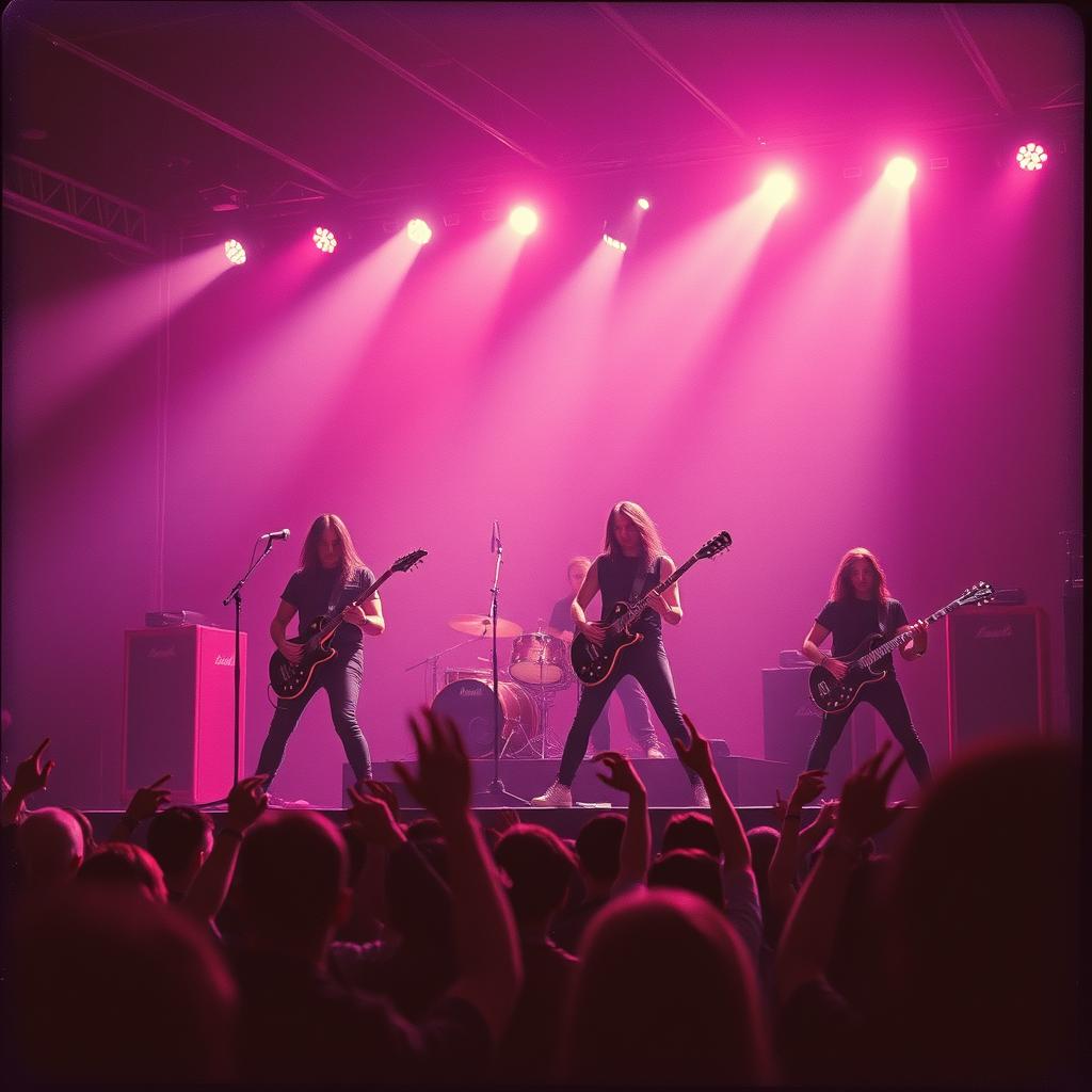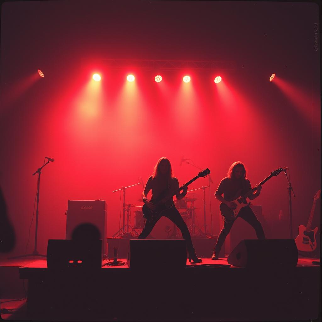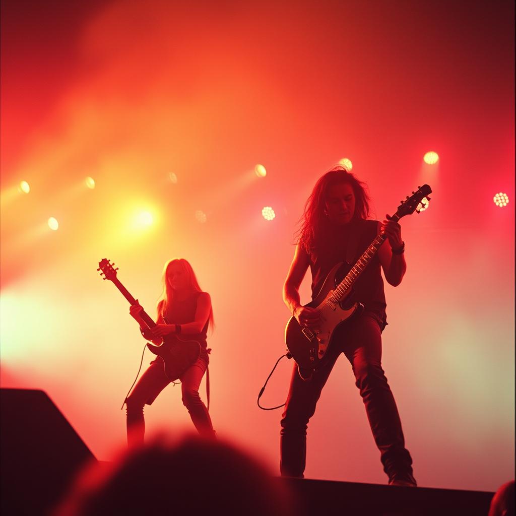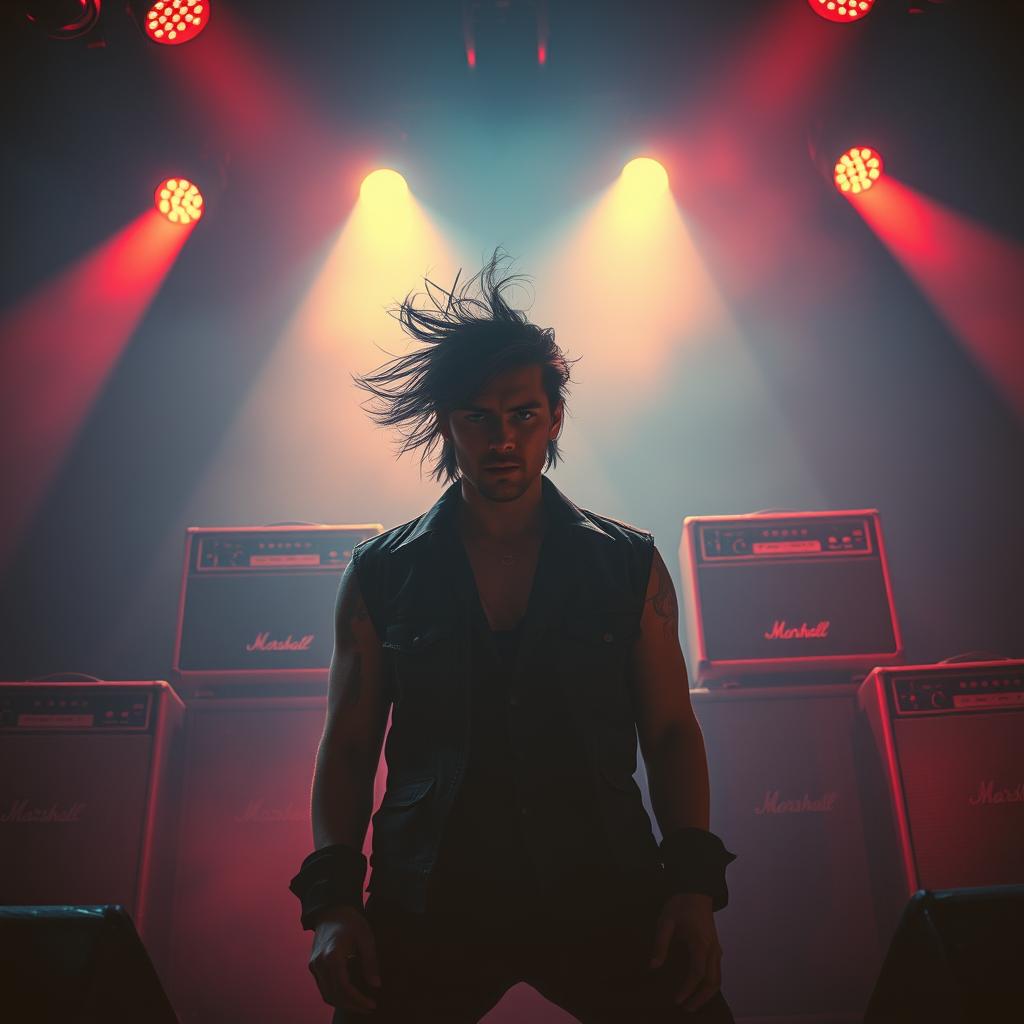 Generate a glam metal 1980's eith british heavy metal 1980's, high energetic driving guitar, twin guitar, stunning guitar, powerful drum, virtuostic guitar, virtuostic bass, rhyrhmic, male metal vocal( counter tenor ), high quality audio, harmonic chorus, high pitched screaming voice