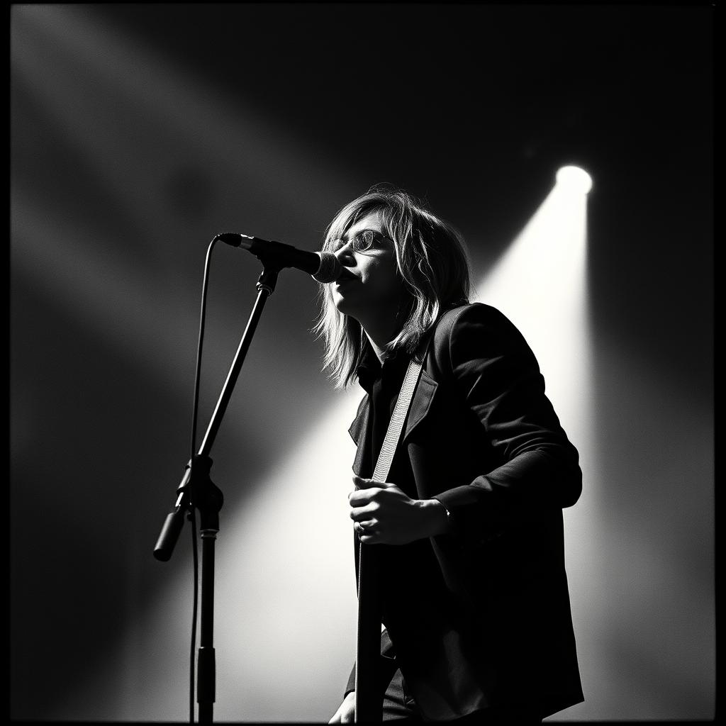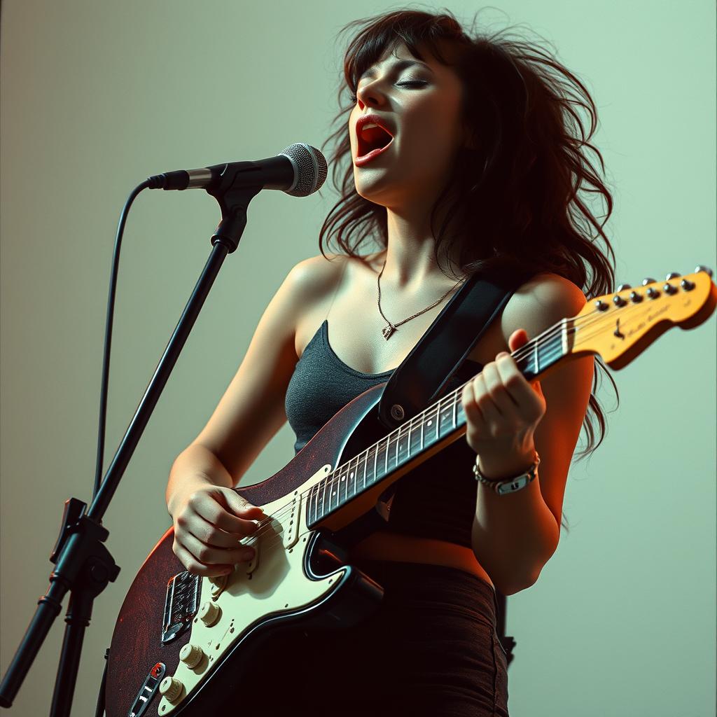 Generate a dance-rock, italo 1980's, synthewave, heavy guitars, 95 bpm, punchy drum, hard slap bass, melodic bass, high pitched screaming voice, blacl female gospel vocal( soprano ), nostalgic melody, live performance
