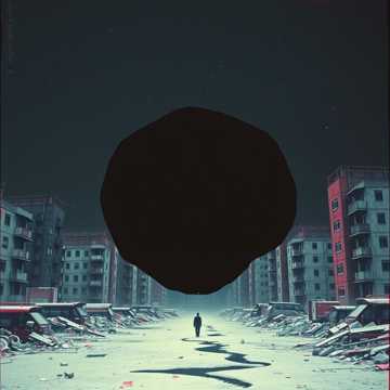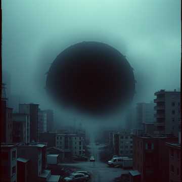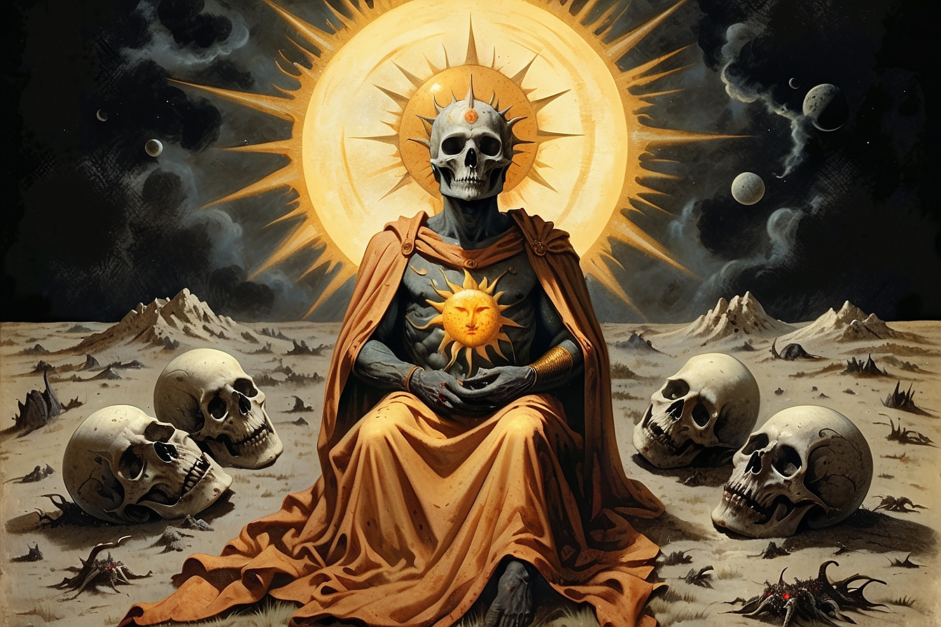 A brutal ultra heavy slow tempo thrash metal onslaught that captures the horror of a collapsing star that turns into a black hole sucking in all nearby planets and even light itself, Relentless palm-muted riffing, jagged gallops, raw heavy distortion, ferocious growled vocals, Music shifts between crushing speed assaults, sinister breakdowns, and eerie melodic passages, Vocals snarl with bellicose menace, Twin guitar harmonies cut through like knives of clarity amid chaos, Drumming is fast, unrelenting, with pounding double bass and hammering snares, The mood is grim, menacing, theatrical — an epic descent into the bowels of a living hell, ‑lazy, ‑predictable, ‑pop rock, ‑male