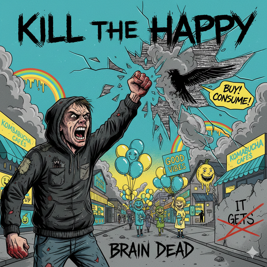 Blistering crossover thrash, 180-220 BPM, down-tuned guitars with razor-sharp palm-muted riffs, relentless double-kick drumming, aggressive shouted vocals mixing hardcore bark with thrash snarls, ultra-short song structure with abrupt tempo changes, rapid-fire satirical commentary, breakdowns with gang-vocal chants, minimal melodic content emphasizing rhythmic brutality, raw lo-fi production with punchy snare and grinding guitar tone, sudden shifts from hyperspeed thrash to mid-tempo mosh sections, dark humor meets genuine aggression, lyrics satirizing societal absurdities with provocative edge, anti-conformity themes wrapped in tongue-in-cheek extremism, intro with isolated bass before explosive blast, verses under 30 seconds, chorus as primal shout-along hook, breakdown sections for maximum pit violence, outro either abrupt stop or chaotic collapse, atmosphere of controlled chaos and rebellious fury, unpolished energy over perfection