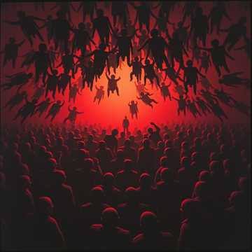 A brutal thrash metal onslaught that captures the menacing struggle between the tyranny of the masses and peer pressure symbolized by the very real danger of crowd crush, Relentless palm-muted riffing, jagged gallops, and ferocious shouted vocals embody domination, addiction, and the suffocating mob rule, Lyrics portray the power of the crowd to overwhelm and destroy individuals, The individual, buried in crushing collectivism, claws upward through torment, confronting conformity with violence and rage, Music shifts between crushing speed assaults, sinister breakdowns, and eerie melodic passages, Vocals snarl with manic menace, Twin guitar harmonies cut through like knives of clarity amid chaos, Drumming is fast, unrelenting, with pounding double bass and hammering snares, The mood is grim, menacing, theatrical — an epic descent into the bowls of a living hell