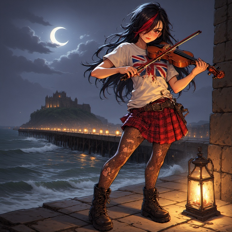 Fast Celtic punk song with gritty mid-range female vocals full of rebellious energy, rowdy pub-singalong feel, and stomping 4/4 kick-snare beat at 165 BPM in D minor, Features driving overdriven rhythm guitar, distorted bass, energetic fiddle leads, bright tin whistle counter-melodies, and warm accordion pads in the choruses, Includes gang shouts on the refrain lines “Blow away, you northern winds…”, Starts with a short fiddle intro over snare roll, then jumps into punchy storytelling verses, raucous choruses, and an instrumental bridge where fiddle and whistle trade fast phrases before the whole band slams back in, Live room reverb, slightly gritty mix, and a sudden stop after the final shout create a sweaty, basement-pub atmosphere