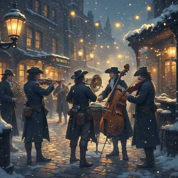 on brass and snow-dusted boots; short hornpipe breaks, rhythmic laughter, distant bell chimes