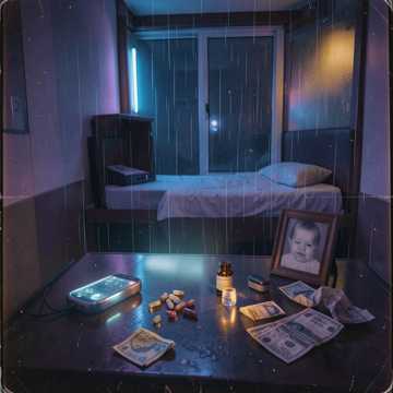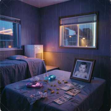 trap, drum and bass, 808 kick rolls, syncopated breakbeats, sub bass glide, detuned smooth piano, g-funk synth lead, muted trumpet stabs, orchestral strings, slap bass, rimshot snare, plate reverb, tape saturation, chopped vocal ad libs, nocturnal menace, bittersweet resolve, 90 BPM, half-time switch
