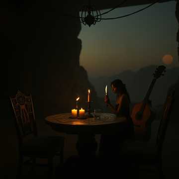 Instrumental only, Dark cinematic Celtic-desert fusion in a shadowy bazaar tavern at twilight, Gittern and oud trade serpentine, predatory melodies, Rasping hurdy-gurdy cranks gritty drones and haunting modal lines, both medieval and menacing, Relentless bodhrán pulses like approaching danger, A lethal femme fatale slides into the seat across from you — fighting leathers, twin long knives glinting, Her arrival sharpens the music: hurdy-gurdy grows colder and taunting, gittern/ou d lines slink with seductive threat, bodhrán tightens, Subtle metallic accents (finger cymbals, blade scrapes) hint at knives, Tension shifts from wary invitation to coiled menace and back, never resolving, Dusty reverb, flickering candlelight, faint bazaar murmurs, unspoken betrayal, Slow-to-mid tempo with predatory surges, Dead Can Dance meets Morricone desert tension via medieval folk and North African drone, Masterful, intoxicating, quietly lethal, --v5, 5