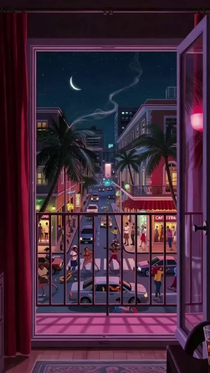 Warm night in a foreign city, Hotel room, open window, Latin music drifting up from the street, Relaxed, hopeful, lightly euphoric, Sound: