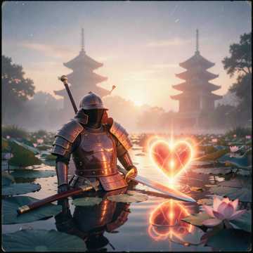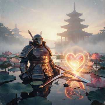 Cinematic oriental electronic fusion, male + female vocals, shakuhachi, taiko drums, emotional build, peaceful yet powerful, samurai spirit, inner peace, heart over conflict, spiritual, epic, uplifting