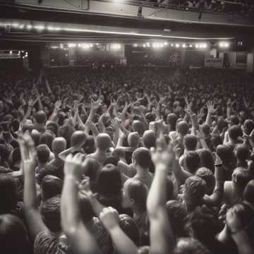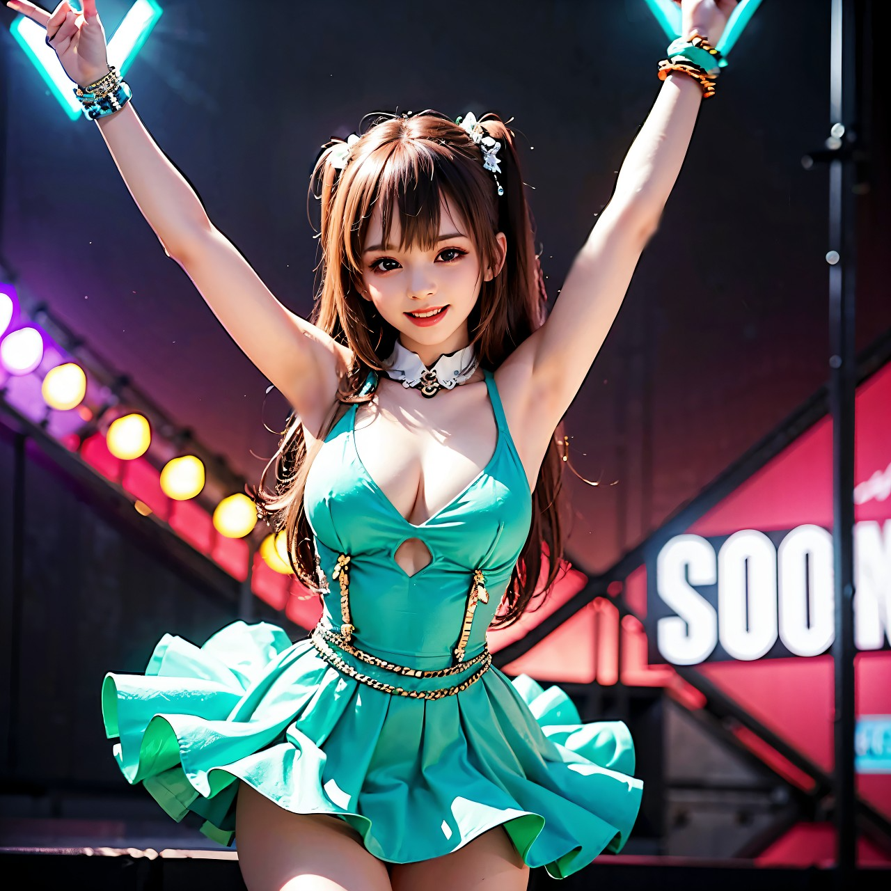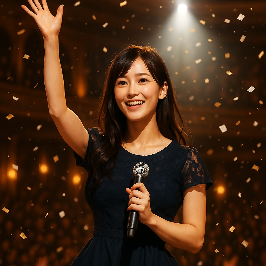 A concert interlude featuring live-style MC speech with energetic crowd cheering, The vocals are not sung, but spoken casually by the performer, as if addressing a live audience, Include real audience reactions such as clapping, shouting, cheering, and call-and-response moments, Female group voice, With Audiences, With crowd noise, Title: “日本迎賓輪華 コンサート2034 MC – Crowd Break”