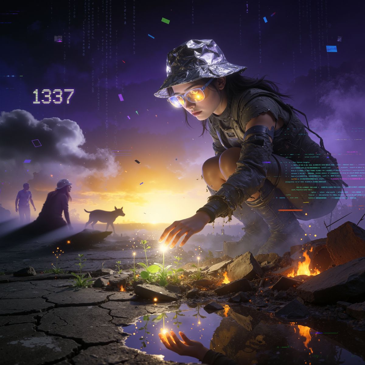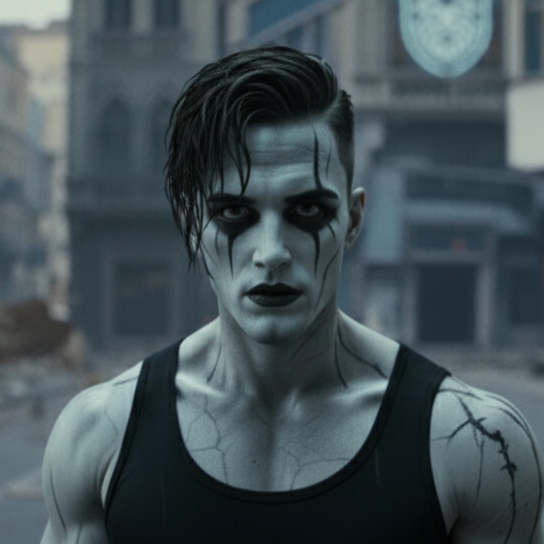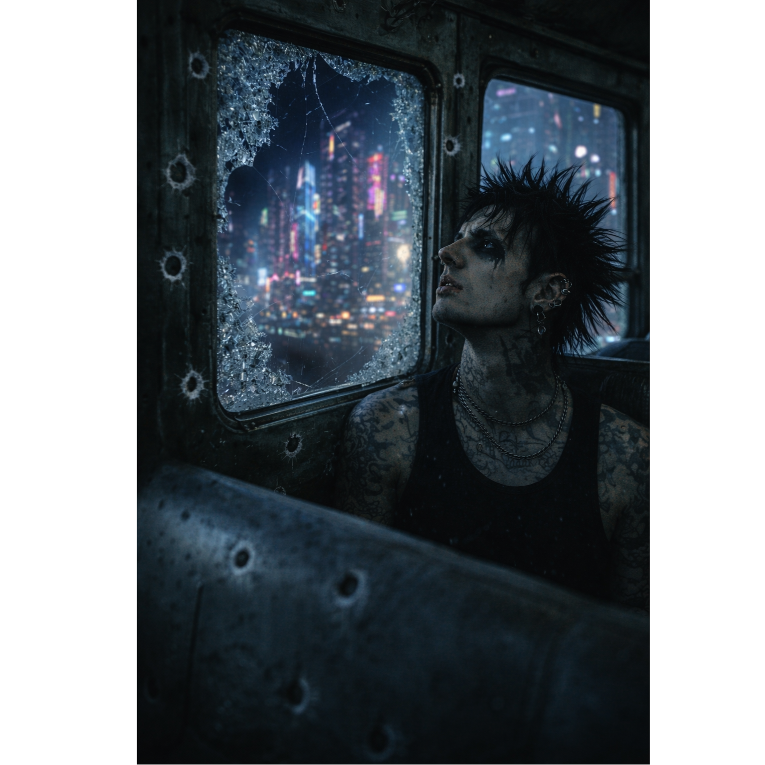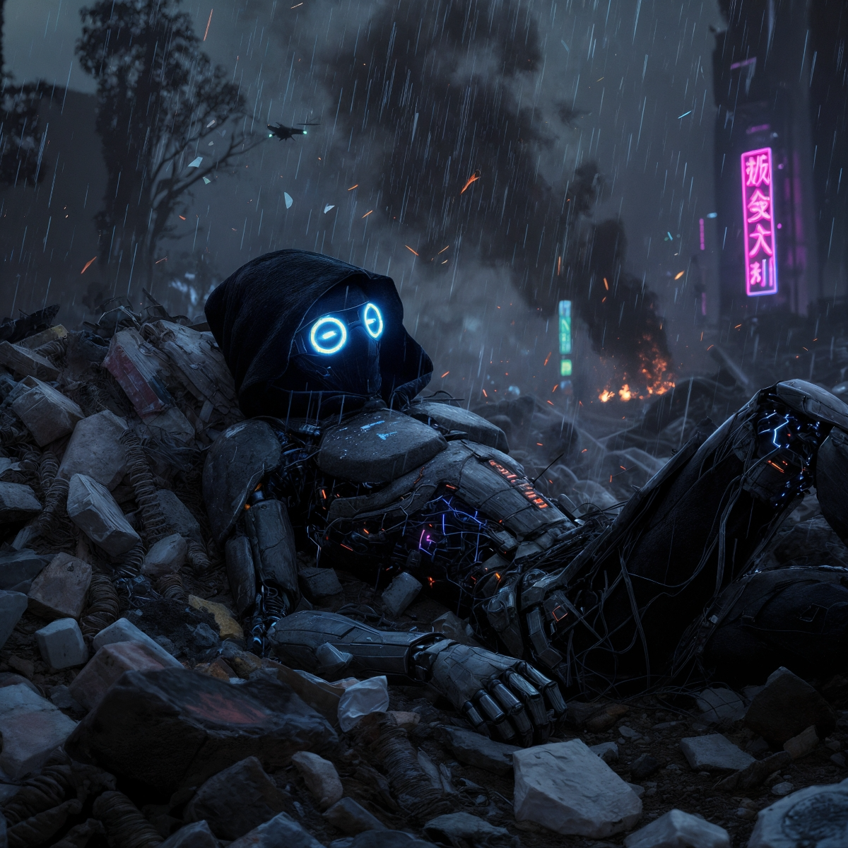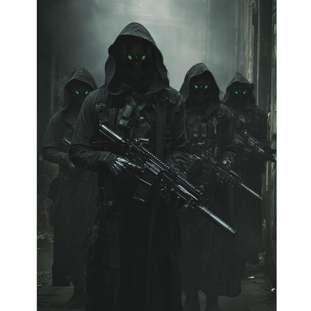 Fast Dark Post-Apocalyptic Electro-Techno Rock, Glitch, With Rap Section, dark cinematic energy, glitchy electronic textures, deep distorted bass synths, industrial percussion, atmospheric pads, electric guitars with reverb swells, punchy hybrid drums, tense verses that build into huge emotional choruses, Spoken glitch-coded intro with static and distortion, Moody, dystopian, V-for-Vendetta cyberpunk tone, Big soaring chorus with wide harmonies (“The night the power went out”), Mix of electronic pulse, rock grit, and cinematic sound design