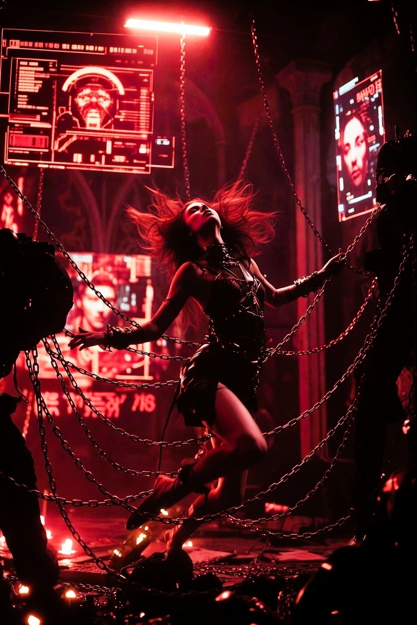 Gritty, club-ready dark EDM / electro-trap, Industrial machine hum and static burst intro, Deep, propulsive bassline with heavy sub-bass, Dark electro-trap rhythm with intricate drum breaks, Turntablism, vinyl scratch accents, Aggressive yet seductive female vocals, Confident female rap section with sharp rhythmic flow, Warped, ethereal synths layered with gritty electronic textures, Futuristic, cyberpunk, underground club atmosphere, High energy, hypnotic, experimental, late-night club sound