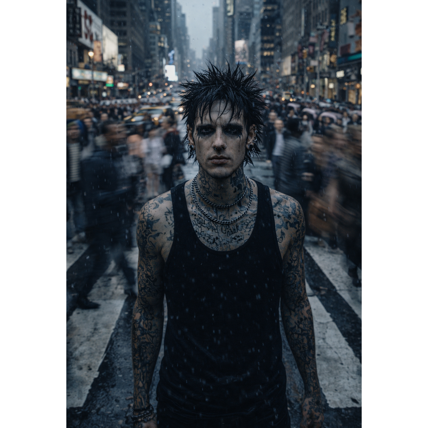 Nu Metal, Gothic, aggressive, melodic chorus, 4 basslines, half diminished chords, experimental, dystopian themes, distorted synth lines, dark, funk, glitches, dolby atmos