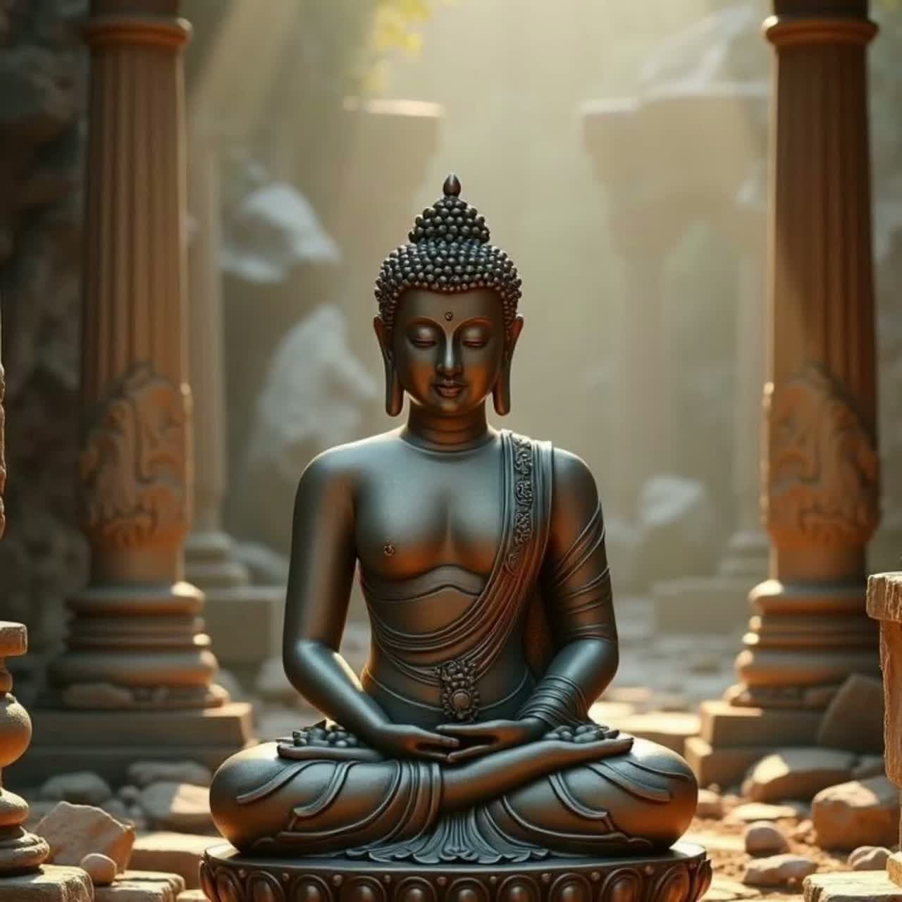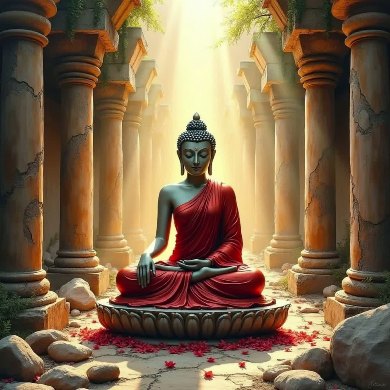Imagine a scene with a richly detailed Buddha statue: gentle features, perfect lotus position, Like the music, it exudes a peaceful and meditative atmosphere, Everything appears simple and pure, surrounded by an ancient temple with broken stone pillars adorned with intricate carvings, cracked walls overgrown with vines and moss, and rubble covered in dust, Soft golden sunlight filters through the ruins, bathing the statue in warm light, A subtle, luminous aura surrounds the Buddha, The stark contrast between destruction and inner peace creates a sacred and serene atmosphere, In the middle section, the tempo and mood shift, A tabla begins slowly, gradually building to an almost hypnotic climax, In the background, the echo of a large taiko drum can be heard, its occasional beats sounding like the heartbeat of the stone Buddha, Towards the end, the music's tempo returns to a meditative state, fading away very slowly with a final gong