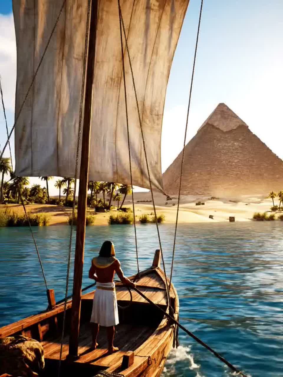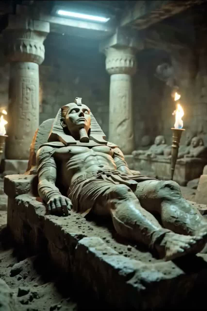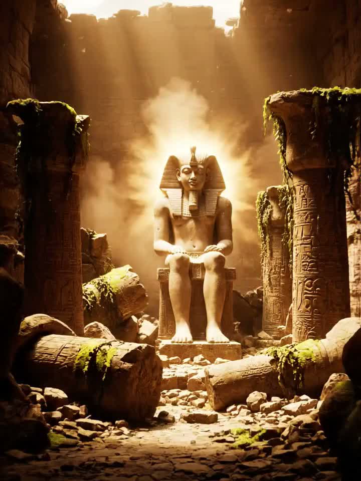 Imagine a scene with a meticulously detailed statue of Ramses: peaceful features, a relaxed pose, Like the music, it exudes a serene and meditative atmosphere, Everything appears simple and pure, surrounded by an ancient pyramid with broken stone columns adorned with intricate carvings, cracked stones overgrown with vines and moss, and dust-covered rubble, Soft, golden sunlight filters through the ruins, bathing the statue in warm light, A subtle, luminous aura surrounds the Ramses statue, The stark contrast between destruction and inner peace creates a sacred and serene atmosphere, In the middle section, the tempo and mood shift, A tabla begins slowly, gradually building to an almost hypnotic climax, In the background, the echo of a large taiko drum can be heard, its occasional beats sounding like the heartbeat of the stone Ramses, Towards the end, the tempo of the music returns to a meditative state and fades away very slowly with a final gong