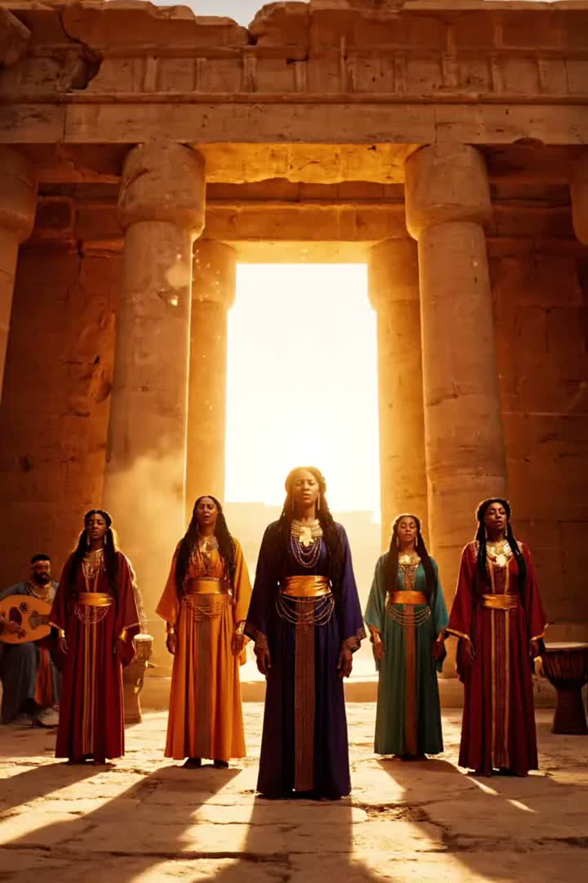 [Cinematic Orchestral], warm brass tones, flowing strings, frame drum ritual percussion, tomb acoustics, [Mystical] [Contemplative], female vocal drones, ancient chant, gradual intensity build, golden desert light, [Historical Drama], measured tempo, 85 bpm, emotional depth, sacred ceremony, oud and duduk accents, layered orchestration, [extended]