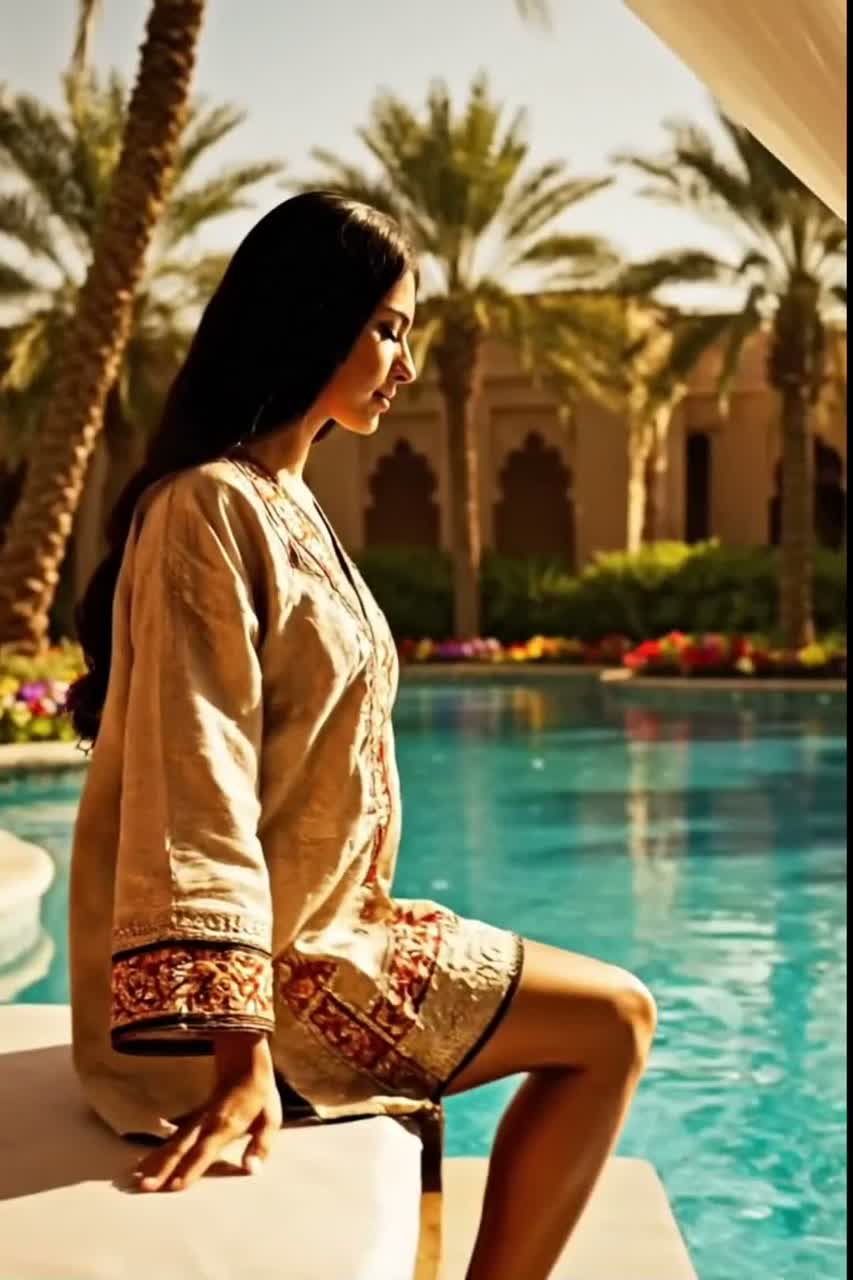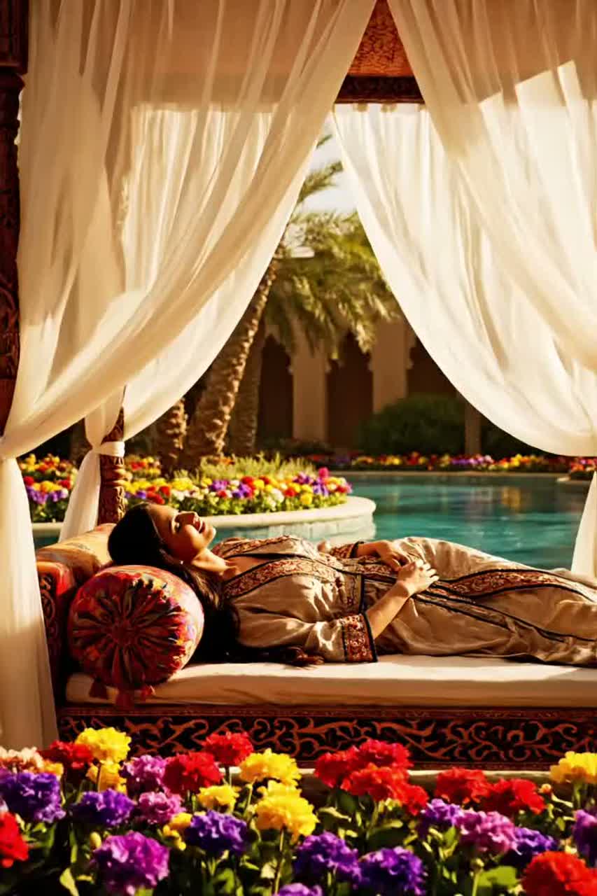 Imagine a lone belly dancer standing in a quiet courtyard, surrounded by ancient sandstone walls bathed in the warm evening sunlight, The music begins with a solitary oud motif, gentle and circular like a slow hip movement, A deep tabla groove enters softly, calm and steady, In the middle, the tabla rhythm gradually builds to a hypnotic climax, urgent and relentless, Then everything slowly recedes—the oud returns alone, fading into the warm stillness of the evening
