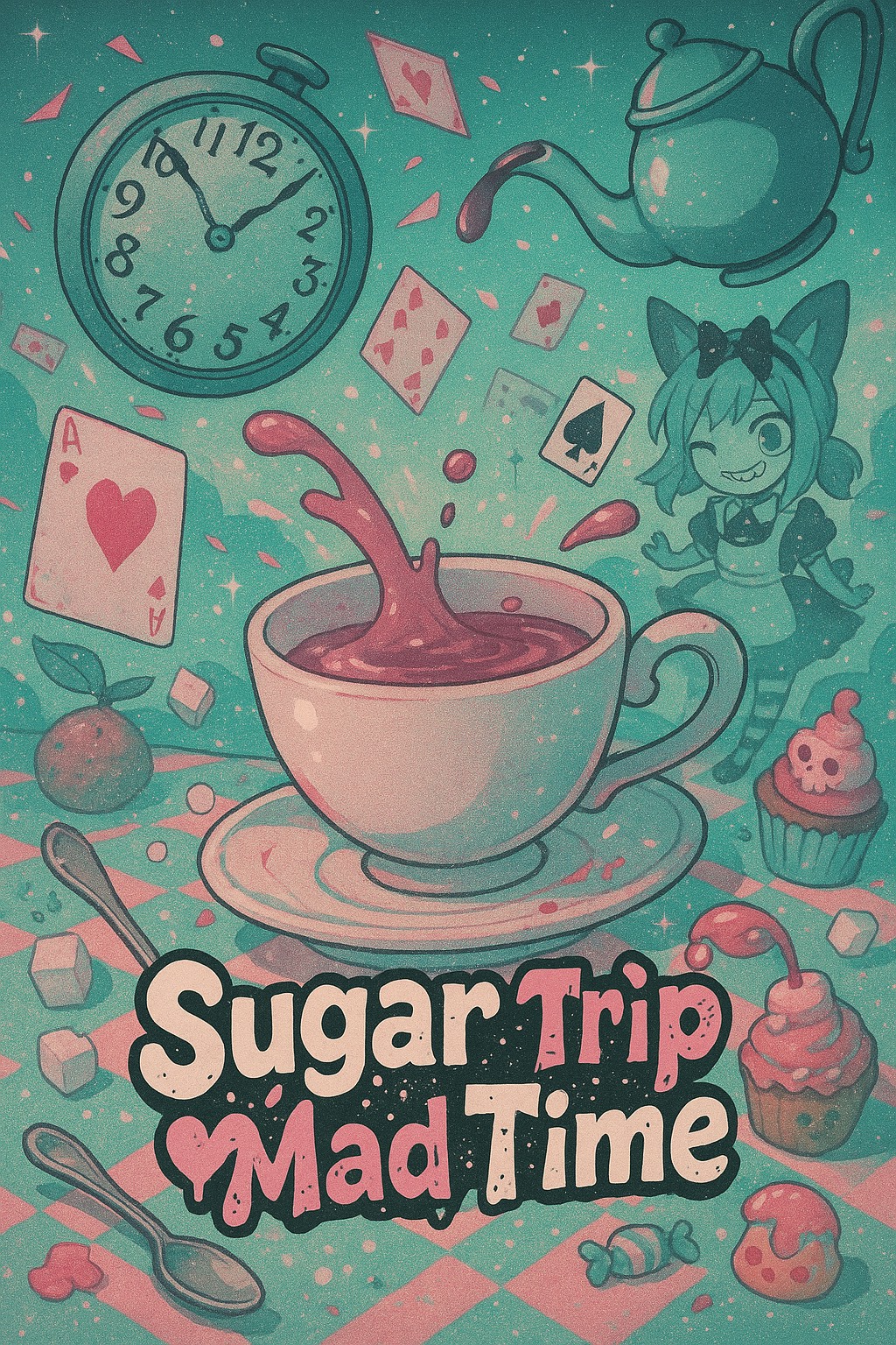 hard EDM, fast rap beats, punchy drums, playful but dark atmosphere, intro with bell-like chimes and metallic tea cup sound, explosive drops, high energy build-ups, cute female Japanese vocal, BPM 155, aggressive yet sweet, chaotic candy party vibe, No harmony vocals
