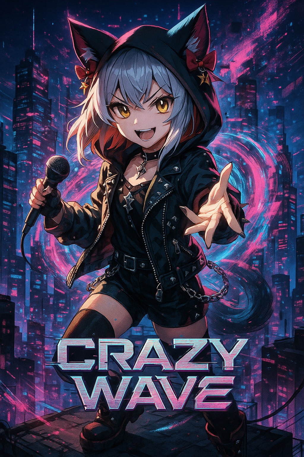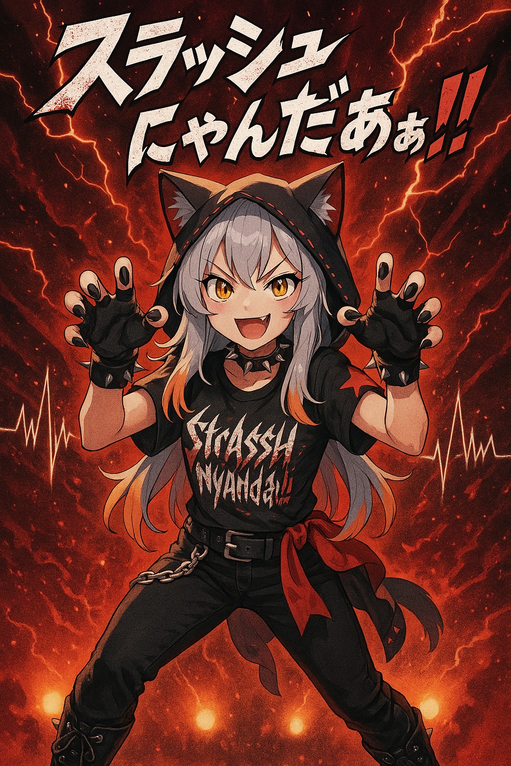 Thrash metal, BPM 200, aggressive, playful but intense, cute female Japanese vocal, no harmony vocals, fast-paced shredding guitars, double kick drums, explosive riffs, breakneck speed sections with rap-like shouting, catchy chorus with kawaii twist, distorted bass, moshpit energy, chaotic but tight rhythm, lyrics about a cat idol slashing the world with cuteness, high-speed verses with English phrases like "Split-second fang to bite!! Too fast, too cute, weaponize!!", bridge darker with sinister strings then back to relentless thrash, ending with powerful repeated shouts