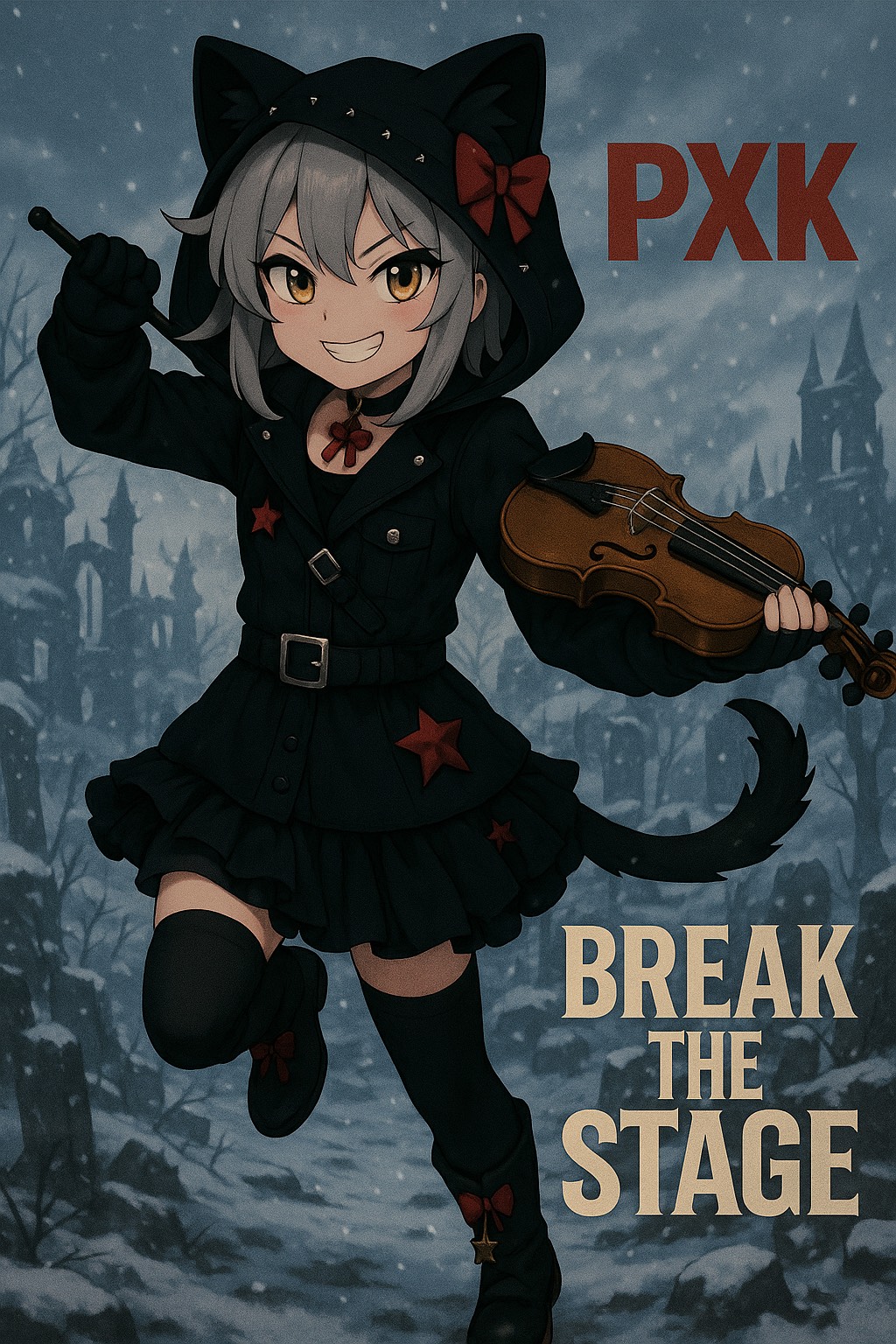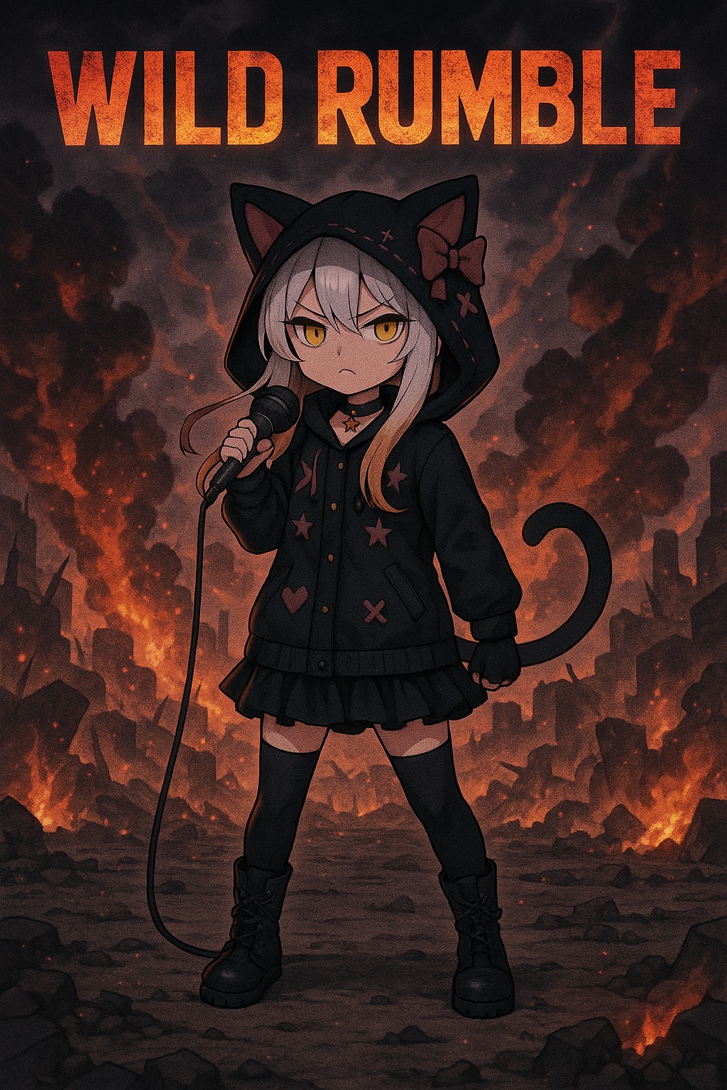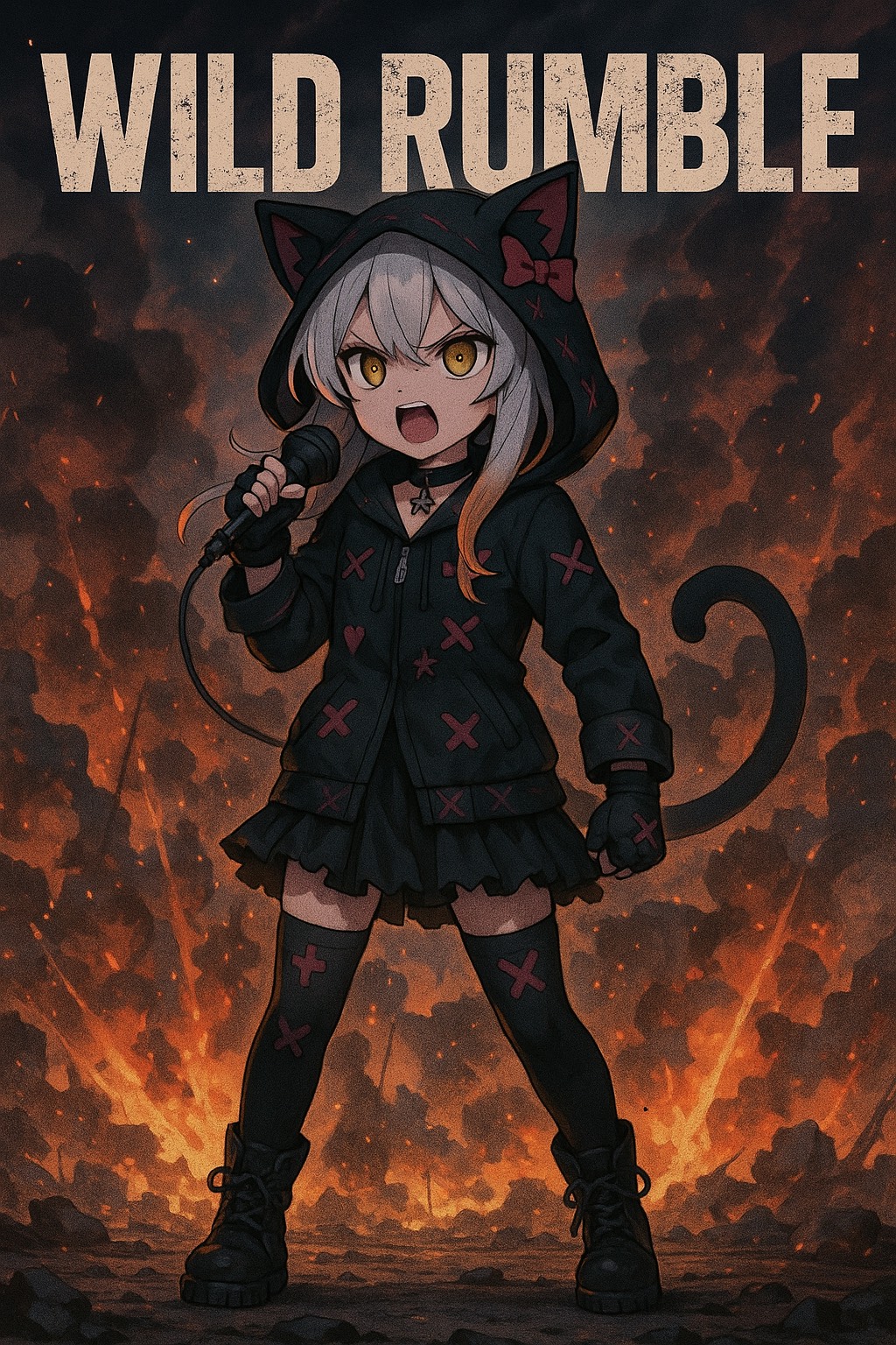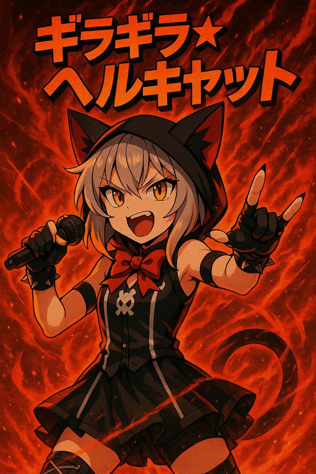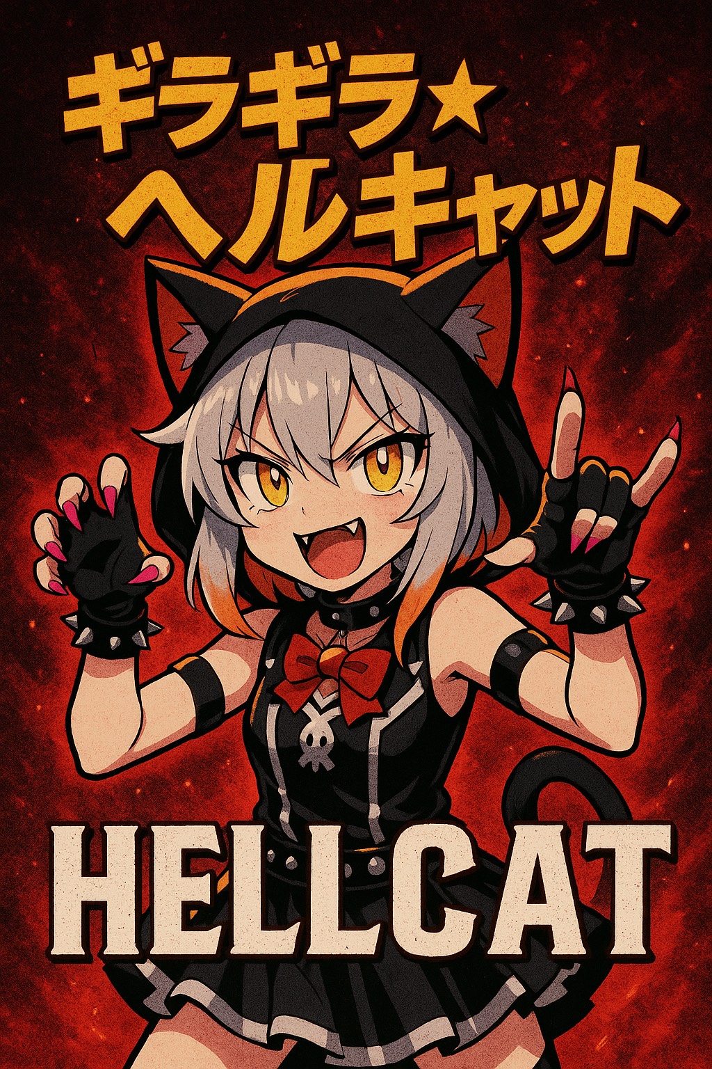 Rap infused style with fast rhythmic vocal delivery, sharp rhymes and playful but dark flow, voice should sound cute yet commanding like a devil neko summoning a sabbath
