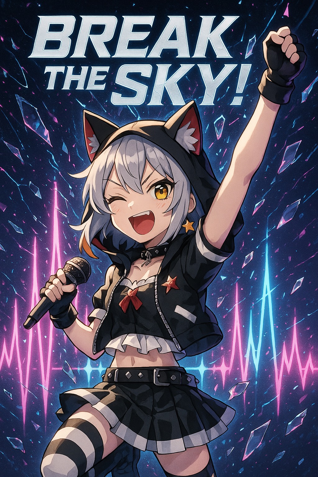 thrash metal, cute metal, fast BPM 190, aggressive but playful, cute female Japanese vocal, No harmony vocals, shredding guitars, blast beats, glitchy breaks, distorted bass, epic metal chorus, chaotic yet catchy